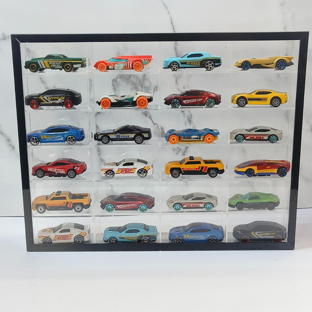 Elevate your collection with this 24-Car Hot Wheels Display Case. designed with 24 individual slots to organize and showcase your Hot Wheels, Matchbox, or scale model cars. Crafted from premium clear acrylic and framed with a modern black border, this display box provides a stylish 360° view of your collectibles. The dustproof enclosure keeps your cars safe from dirt and scratches, ensuring they remain in mint condition. Whether mounted on a wall or placed on a tabletop, this sleek case is a must-have for collectors, adding elegance, order, and protection to your treasured collection. 🚗✨