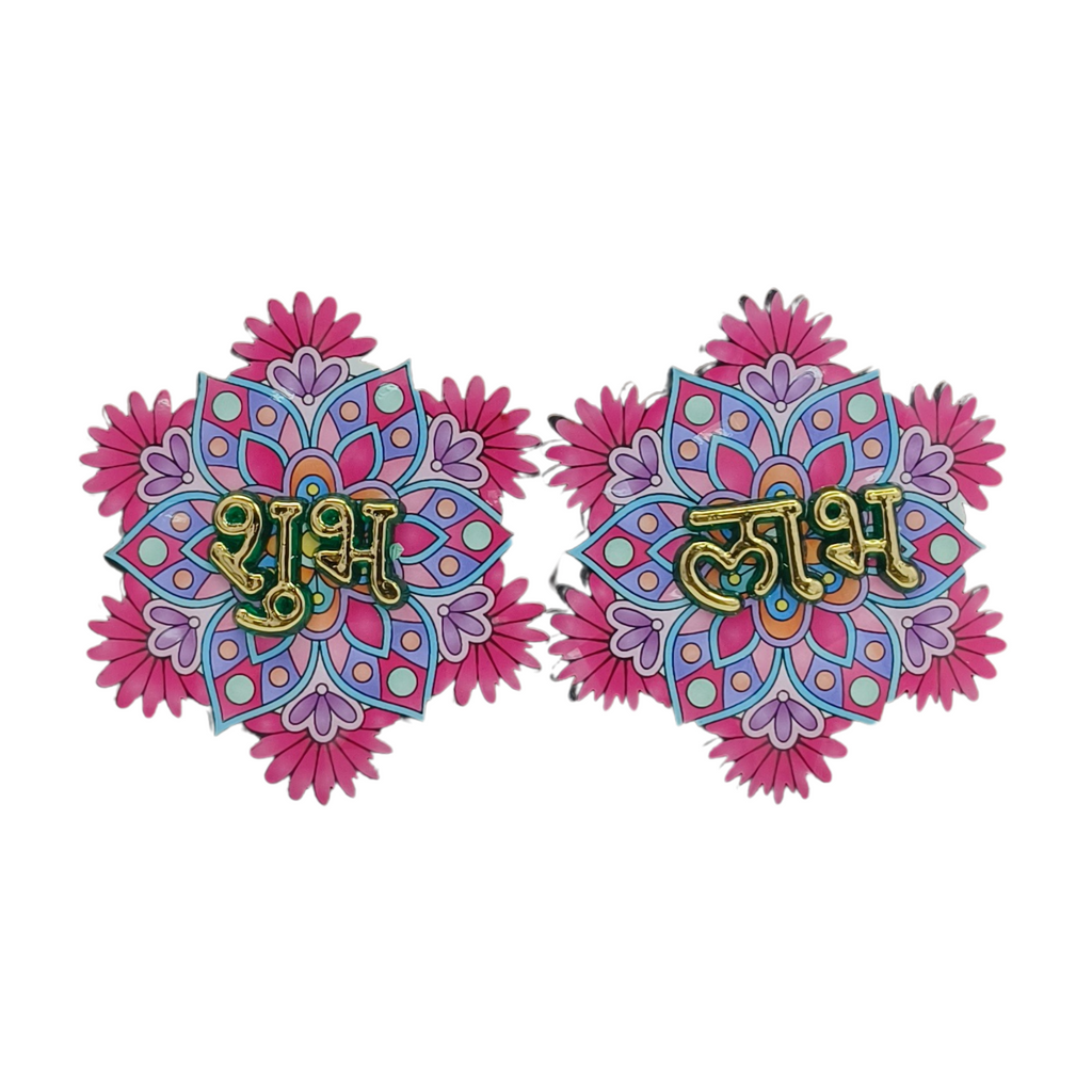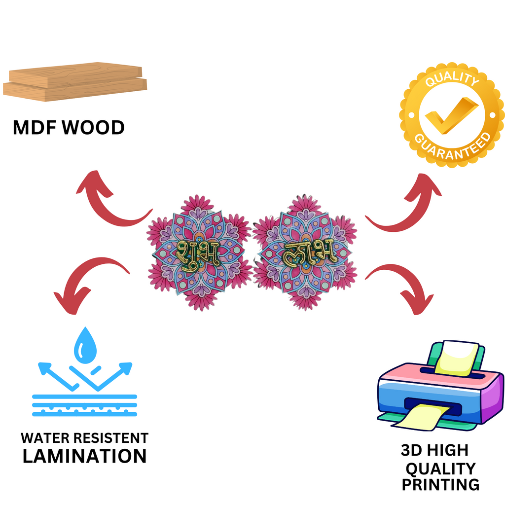 Enhance your festive décor with this 3D MDF Shubh Labh Pink Floral Mandala Design, a beautiful expression of tradition and positivity. The charming pink and purple floral mandala design highlights the golden embossed Shubh and Labh lettering, which signifies good fortune, blessings, and prosperity. The 3D layered detailing gives it a premium, eye-catching look that instantly elevates any festive setup. Crafted from durable MDF, it is eco-friendly, reusable, and lightweight, making it perfect for doors, pooja rooms, and entrances. This auspicious décor piece spreads divine vibes and is an elegant way to welcome guests during Diwali and other celebrations.