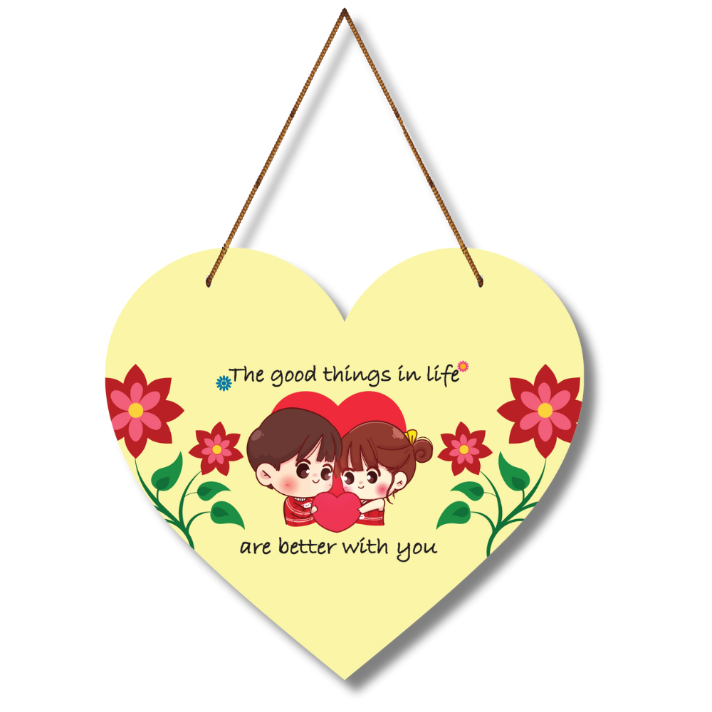 Celebrate love and togetherness with this adorable heart-shaped wooden wall hanging featuring the message “The good things in life are better with you.” Decorated with cute cartoon couple art and floral designs, it’s a perfect gift for your partner or loved ones. Ideal for bedrooms, living spaces, or special occasions, this piece adds warmth, affection, and charm to any wall.