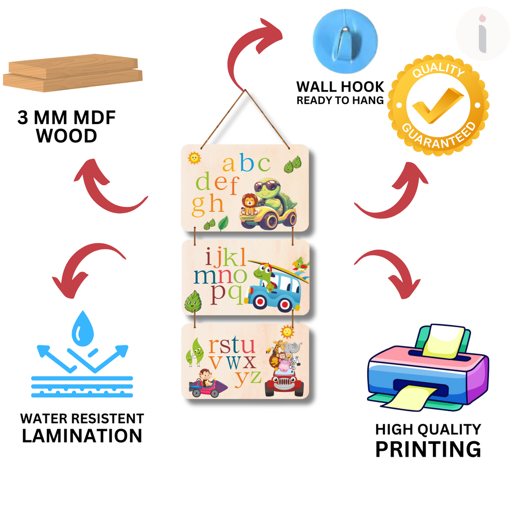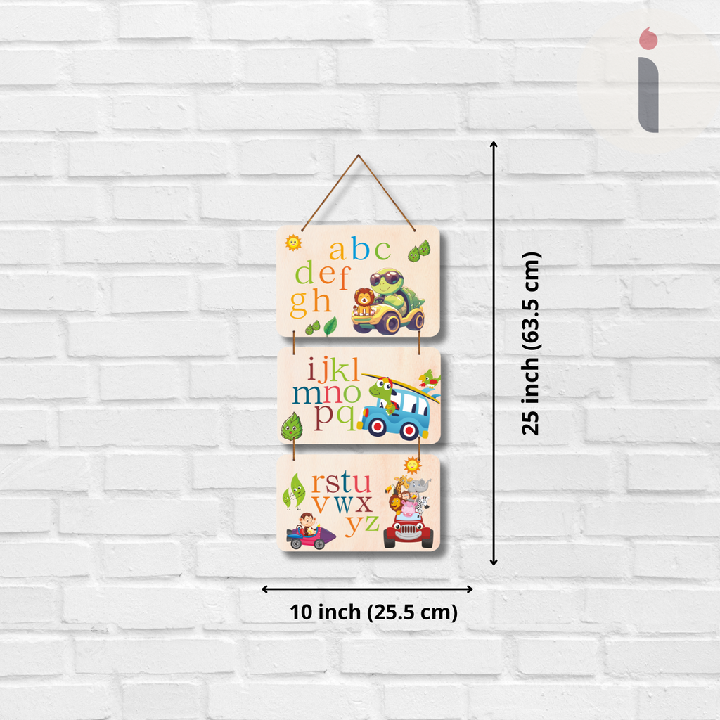 Make learning the alphabet an adventure with this colorful and playful ABC wall hanging, designed especially for toddlers and preschoolers! Each of the three connected panels displays the entire lowercase English alphabet in vibrant colors alongside adorable animal characters driving fun vehicles like cars, buses, and rockets.
