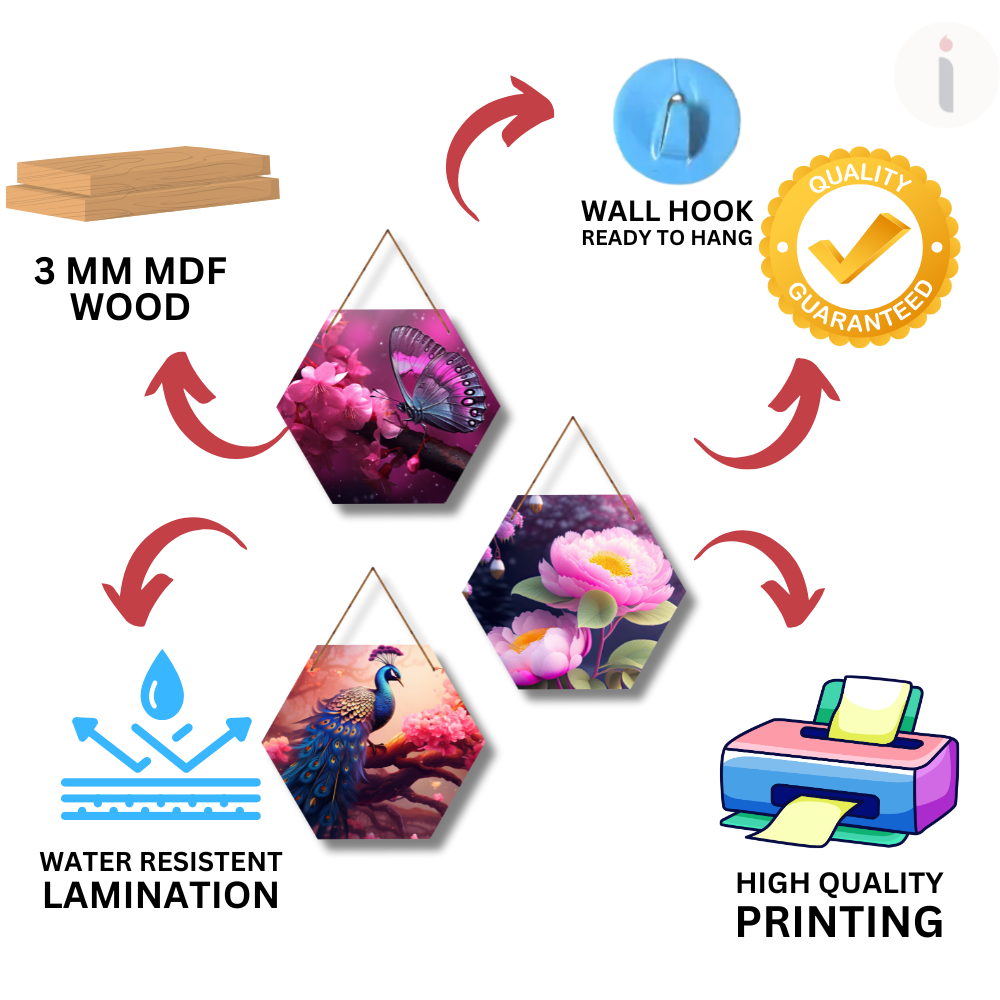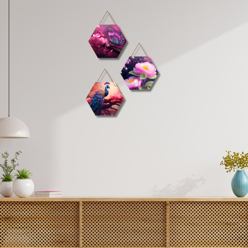 Beautify your walls with this elegant hexagon wooden wall hanging set featuring vibrant nature-inspired designs – a delicate butterfly on blossoms, blooming lotus flowers, and a majestic peacock on a floral branch. The stunning colors and artistic patterns bring sophistication and charm to any space. Perfect for living rooms, bedrooms, or gifting, this décor adds freshness and timeless beauty.