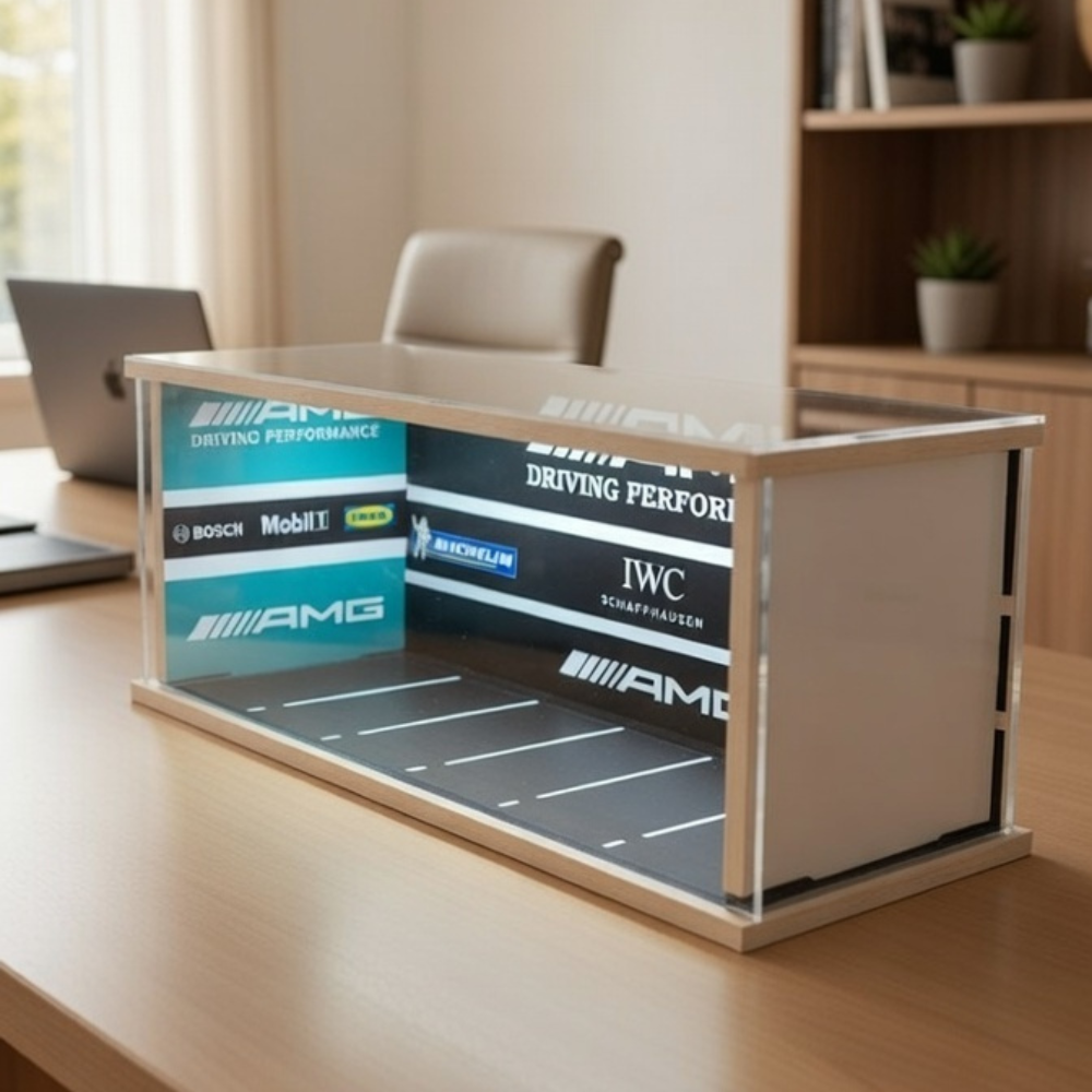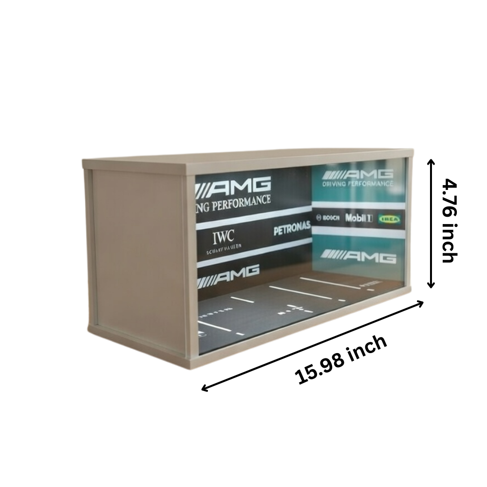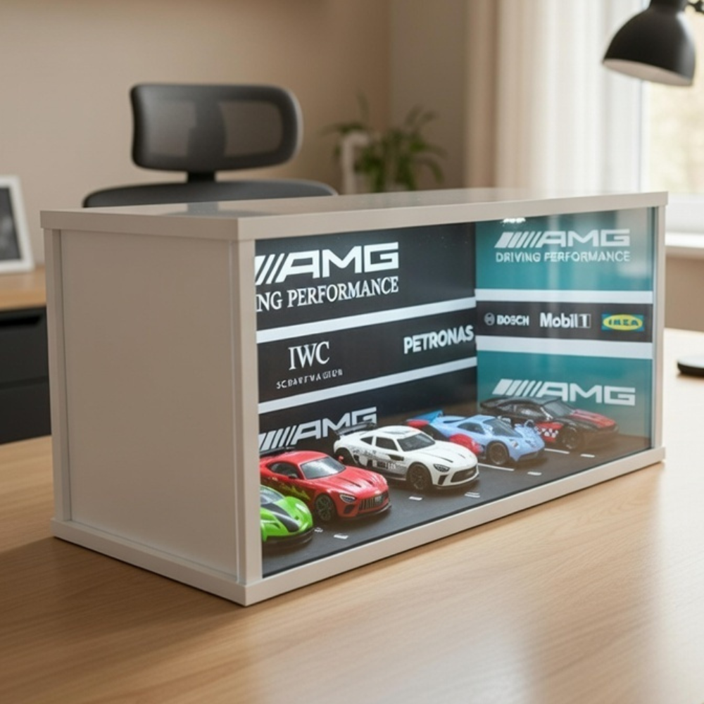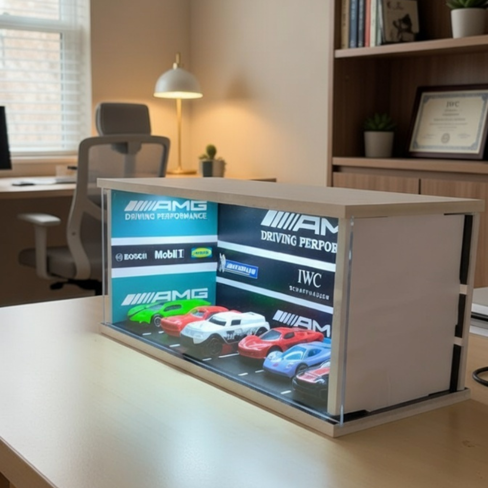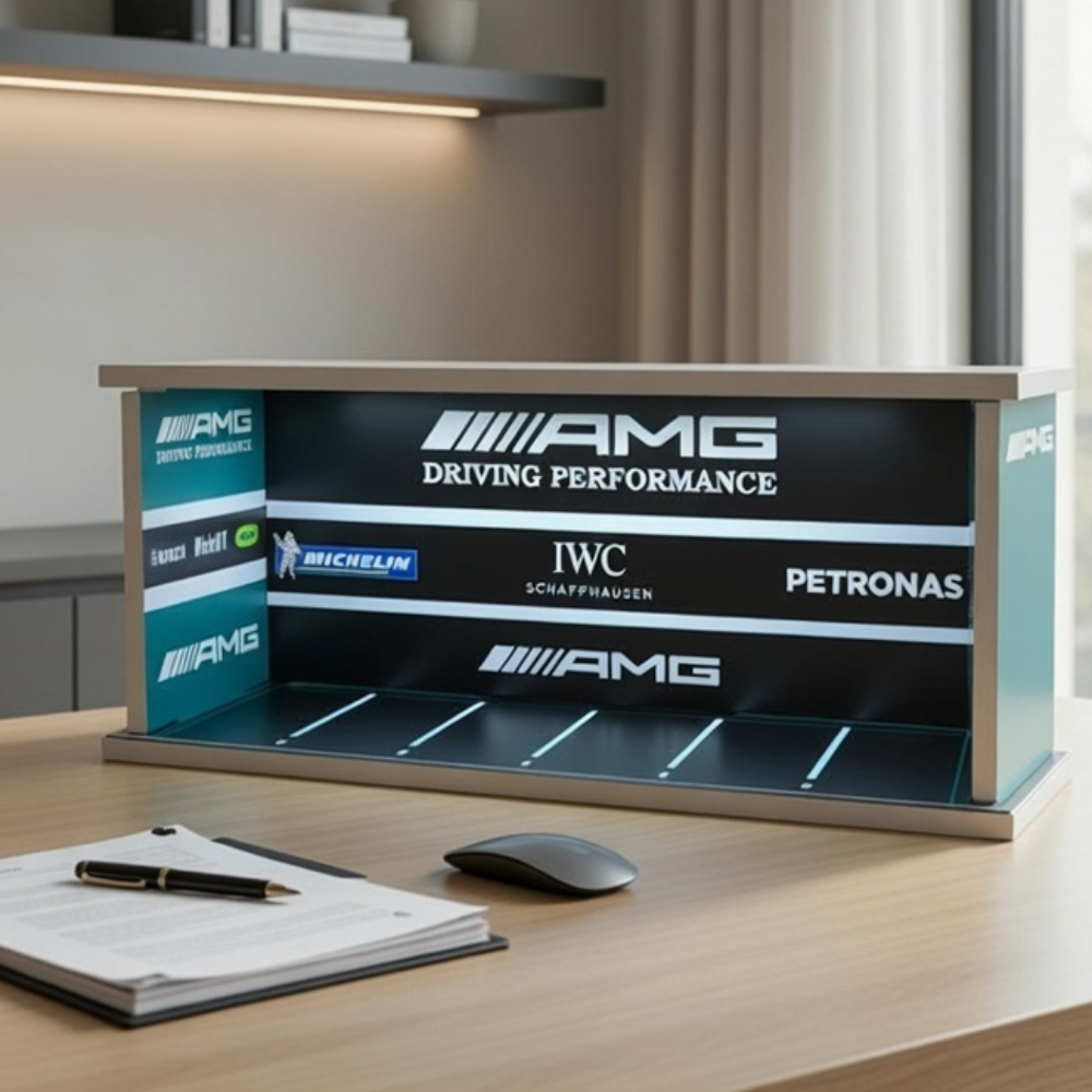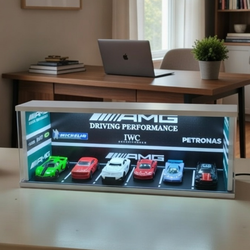 AMG Premium Luxury Car Diorama is a sleek, illuminated display crafted for collectors who value precision, branding, and visual impact. The design recreates a motorsport pit-lane atmosphere with sharp graphics, realistic parking lines, and ambient LED lighting that highlights every detail. Its premium finish elevates desks, shelves, and showcases, turning model cars into statement pieces. Clean edges, balanced proportions, and a modern color palette deliver a showroom-grade presence that feels refined, bold, and unmistakably performance-driven. 🏁