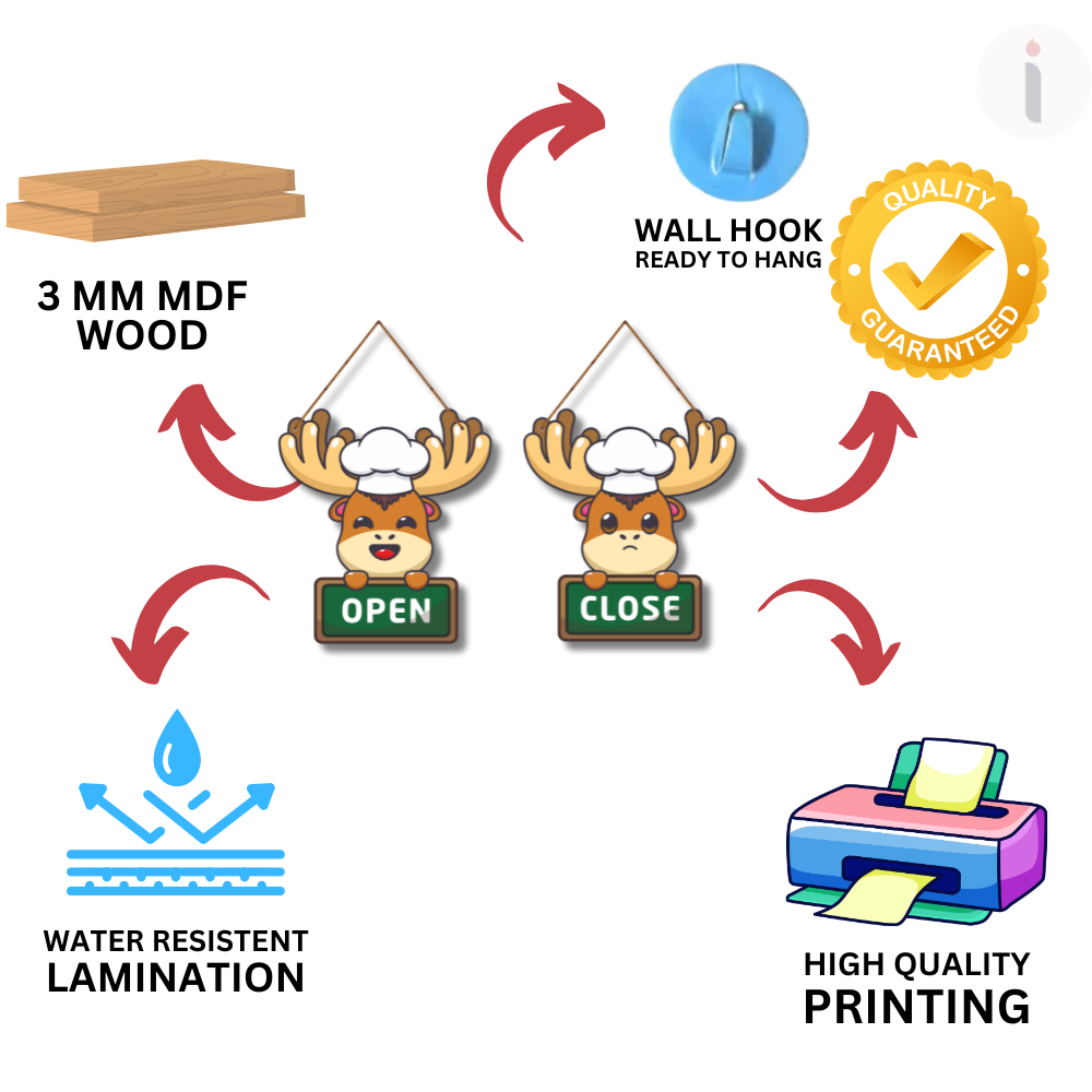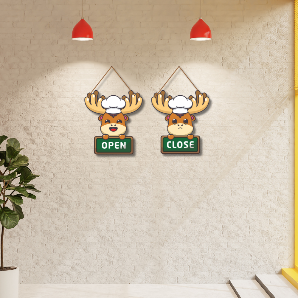 Add a playful touch to your shop, café, or restaurant with this adorable reindeer-themed open-close signboard. Featuring a cheerful reindeer for “Open” and a cute sad-faced reindeer for “Close,” it makes your entrance lively and welcoming. A fun and functional décor piece, perfect for catching attention and letting customers know your store timings with style.