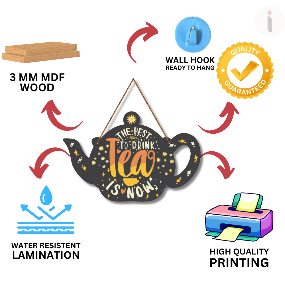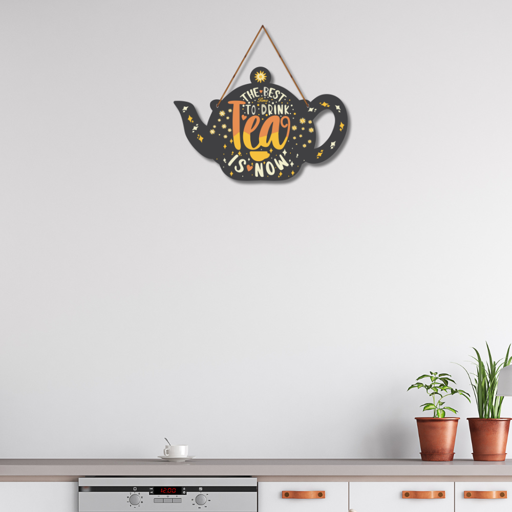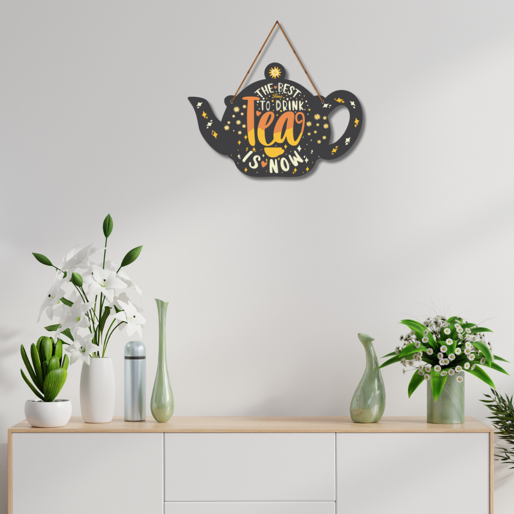 Celebrate your love for tea with this delightful teapot-shaped wooden wall hanging. Featuring the cheerful quote “The best time to drink tea is now”, it brings warmth and coziness to your kitchen, dining, or café corner. A perfect gift for tea lovers, this piece spreads comfort, charm, and timeless tea-time vibes.