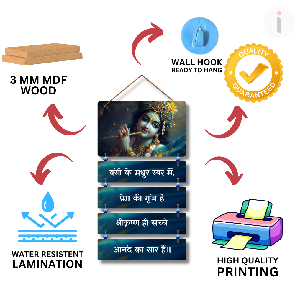 This beautiful Lord Krishna wall hanging showcases divine grace with a serene flute pose and meaningful Hindi shloka. The soothing colors and spiritual message symbolize love, peace, and eternal bliss. Perfect for home temples, living spaces, or meditation rooms, it brings a calm, devotional atmosphere and makes a thoughtful spiritual gift.