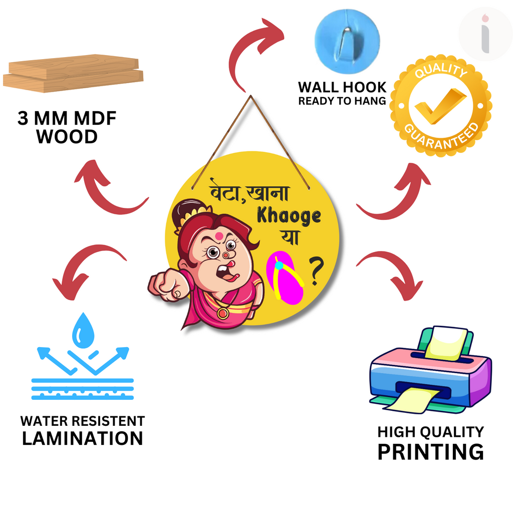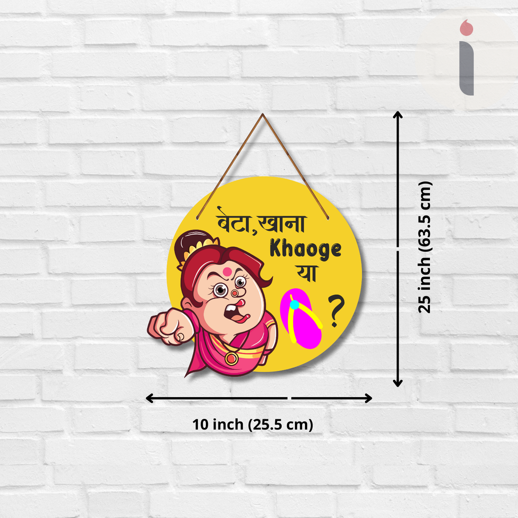 Add humor to your home with this hilarious wall hanging inspired by every desi mom ever! Featuring the iconic line “Beta, khana khaoge ya chappal?”, it brings laughter and nostalgia to kitchens, dining areas, or kids’ rooms. A perfect gift for moms or anyone who’s grown up in an Indian household!