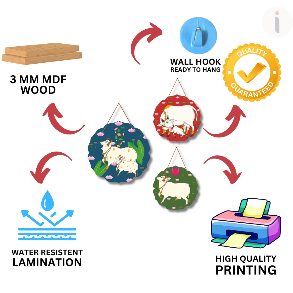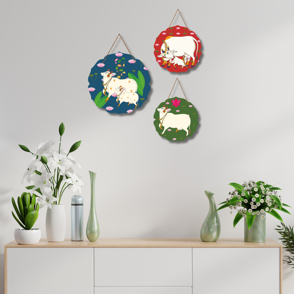 Enhance your home with the sacred beauty of Kamdhenu and her calf, symbolizing prosperity, purity, and abundance. These round wall hangings in vibrant backgrounds of blue, red, and green feature lotus motifs, creating a serene and spiritual aura. Perfect for pooja rooms, living spaces, or gifting, this artwork brings blessings and harmony.