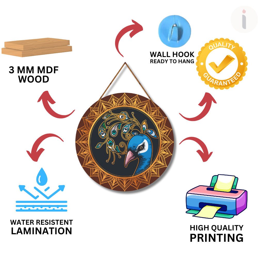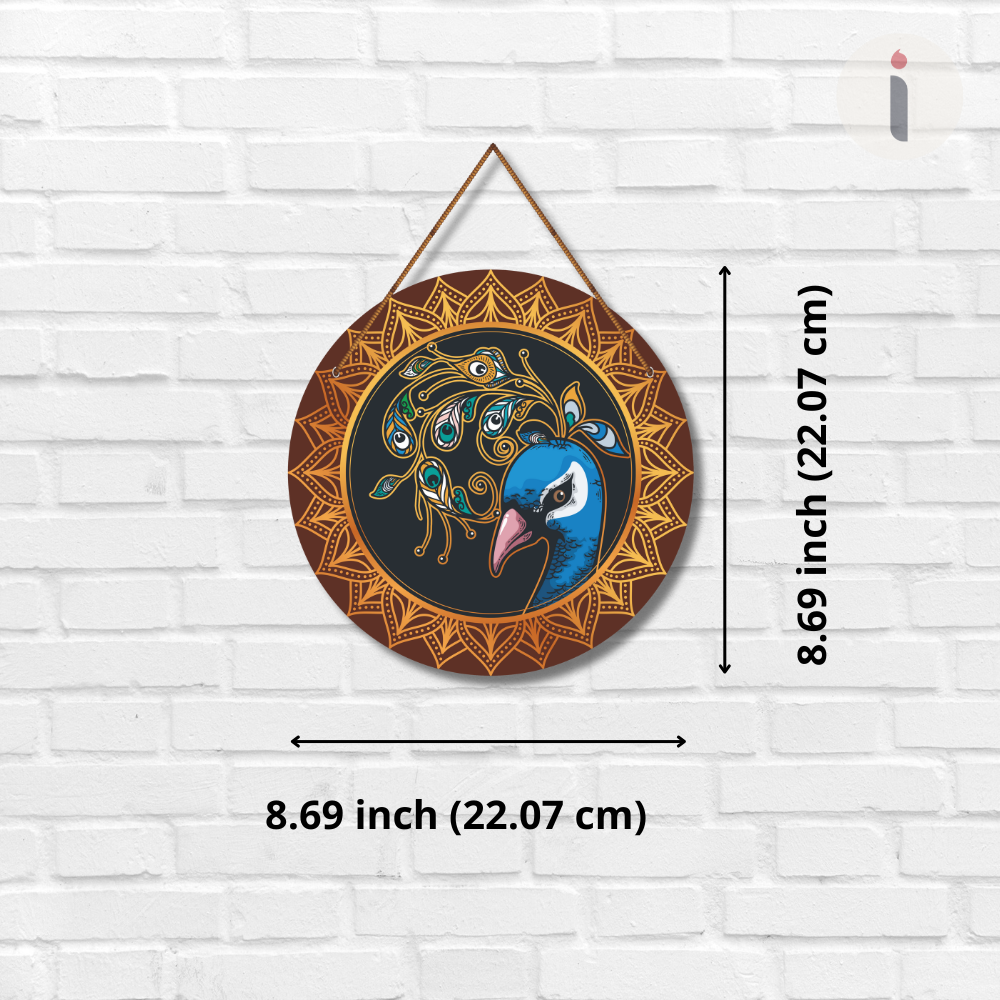 Adorn your walls with the grace of this Majestic Peacock Mandala wall hanging. The vibrant peacock design, surrounded by intricate golden mandala patterns, symbolizes beauty, pride, and prosperity. Perfect for adding a royal and artistic touch to your home décor, this piece reflects traditional artistry with a modern charm, making it an eye-catching centerpiece.