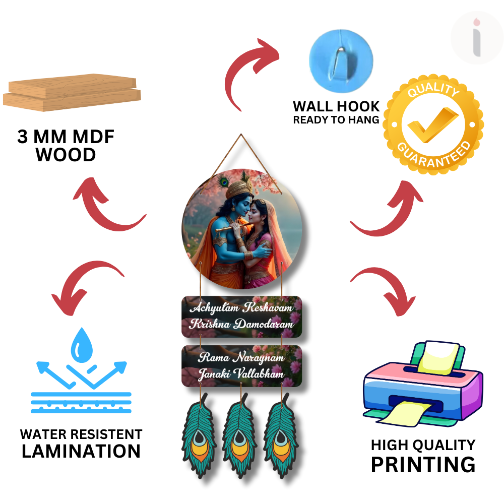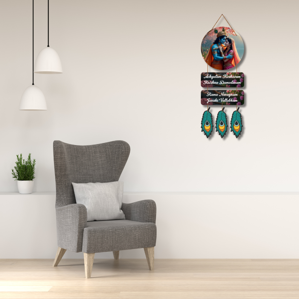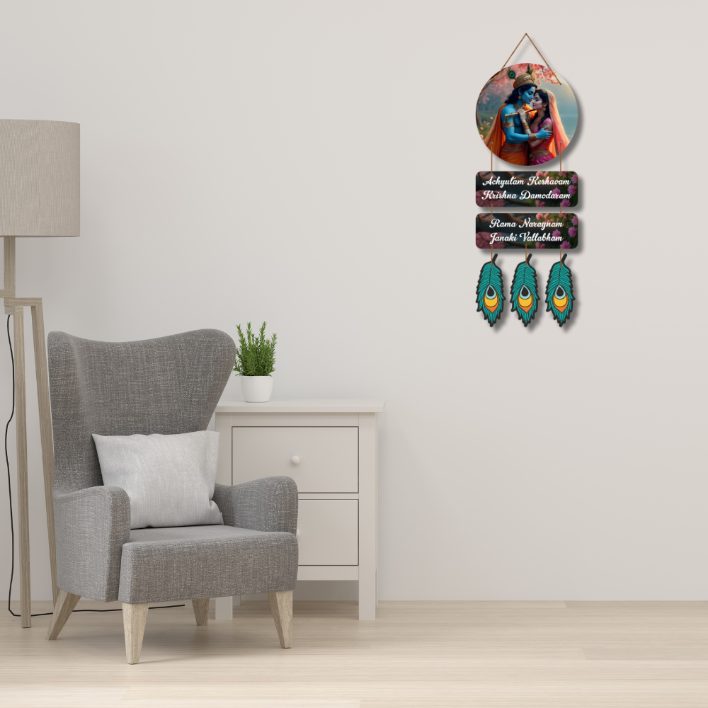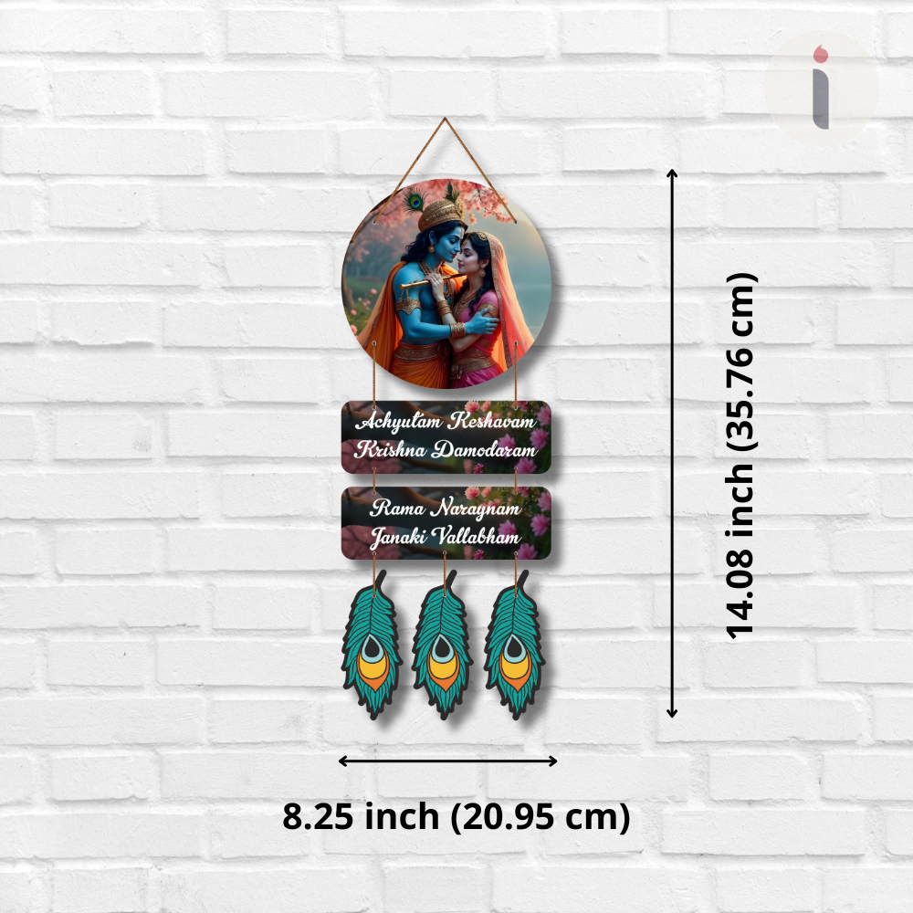This elegant wall hanging features Lord Krishna and Radha in a divine embrace, beautifully paired with sacred verses like Achyutam Keshavam, Krishna Damodaram, Rama Narayanam, Janaki Vallabham. Accented with vibrant peacock feathers, it symbolizes eternal love and devotion. A perfect piece to bring positivity, peace, and spiritual grace to your home, mandir, or as a thoughtful gift.