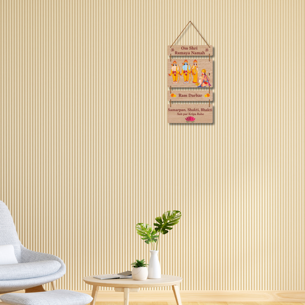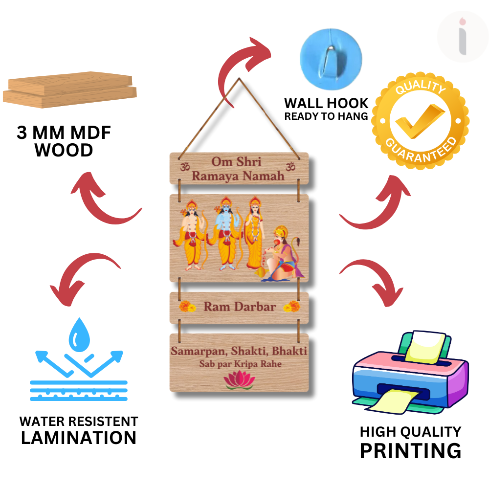 Bring devotion and harmony into your home with this sacred Ram Darbar wooden wall hanging. Featuring Lord Ram, Sita, Lakshman, and Hanuman with the mantra “Om Shri Ramaya Namah”, it symbolizes faith, strength, and protection. Perfect for pooja rooms, meditation spaces, or gifting, this décor radiates samarpan, shakti, and bhakti with divine blessings.