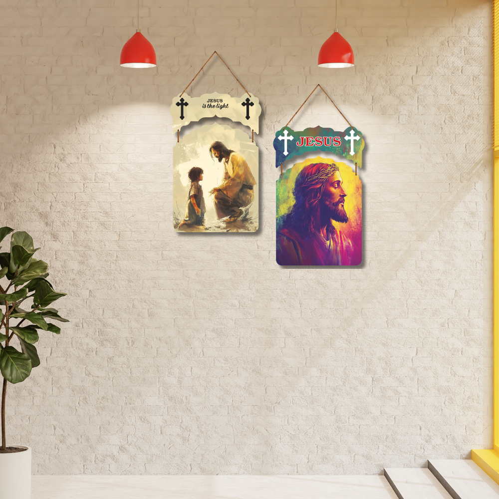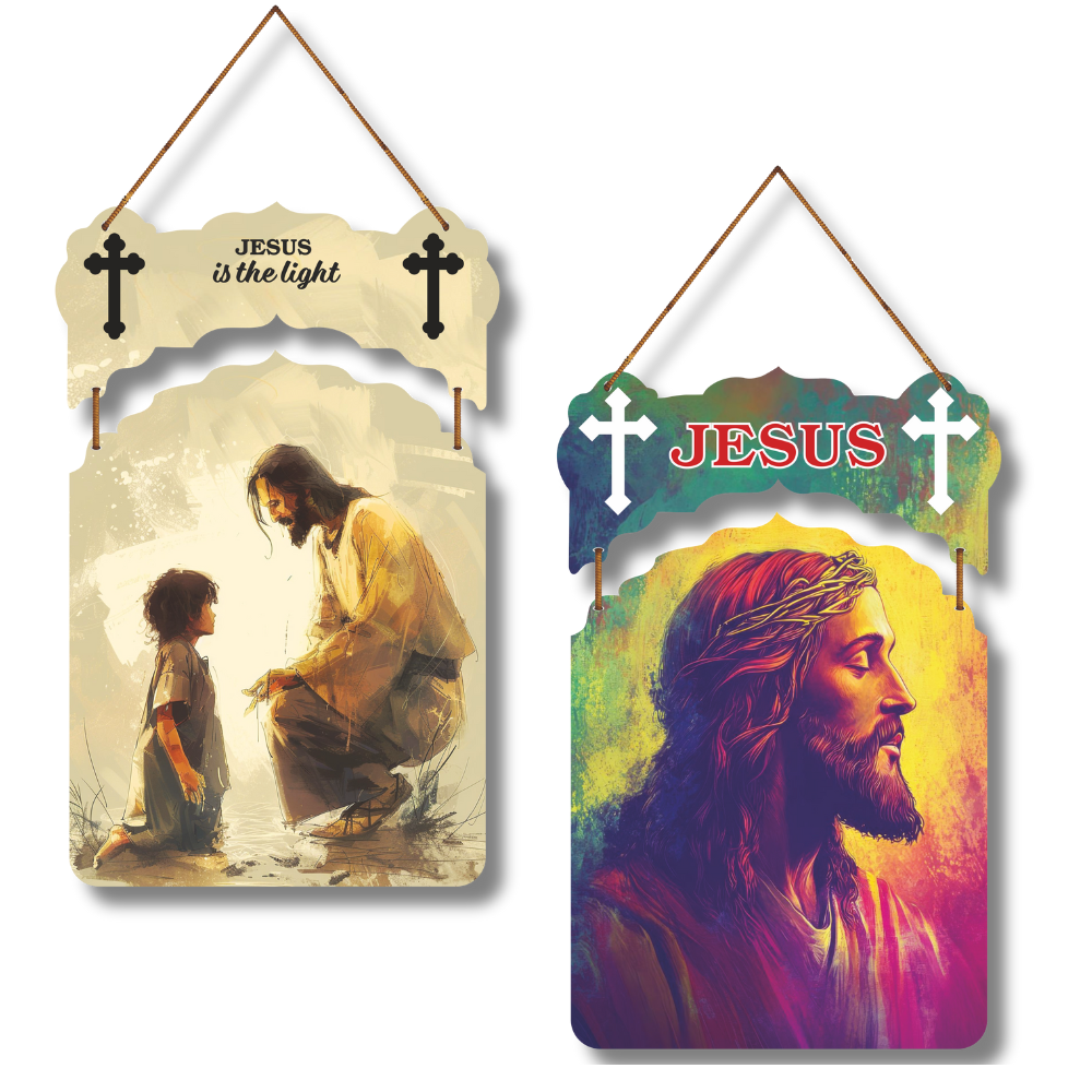 This wall hanging set beautifully depicts Jesus Christ with divine grace and compassion. One artwork shows Jesus guiding a child with love, while the other reflects His serene presence with the crown of thorns. A perfect blend of faith and artistry, this set brings peace, hope, and spiritual strength to any home, prayer corner, or church décor.