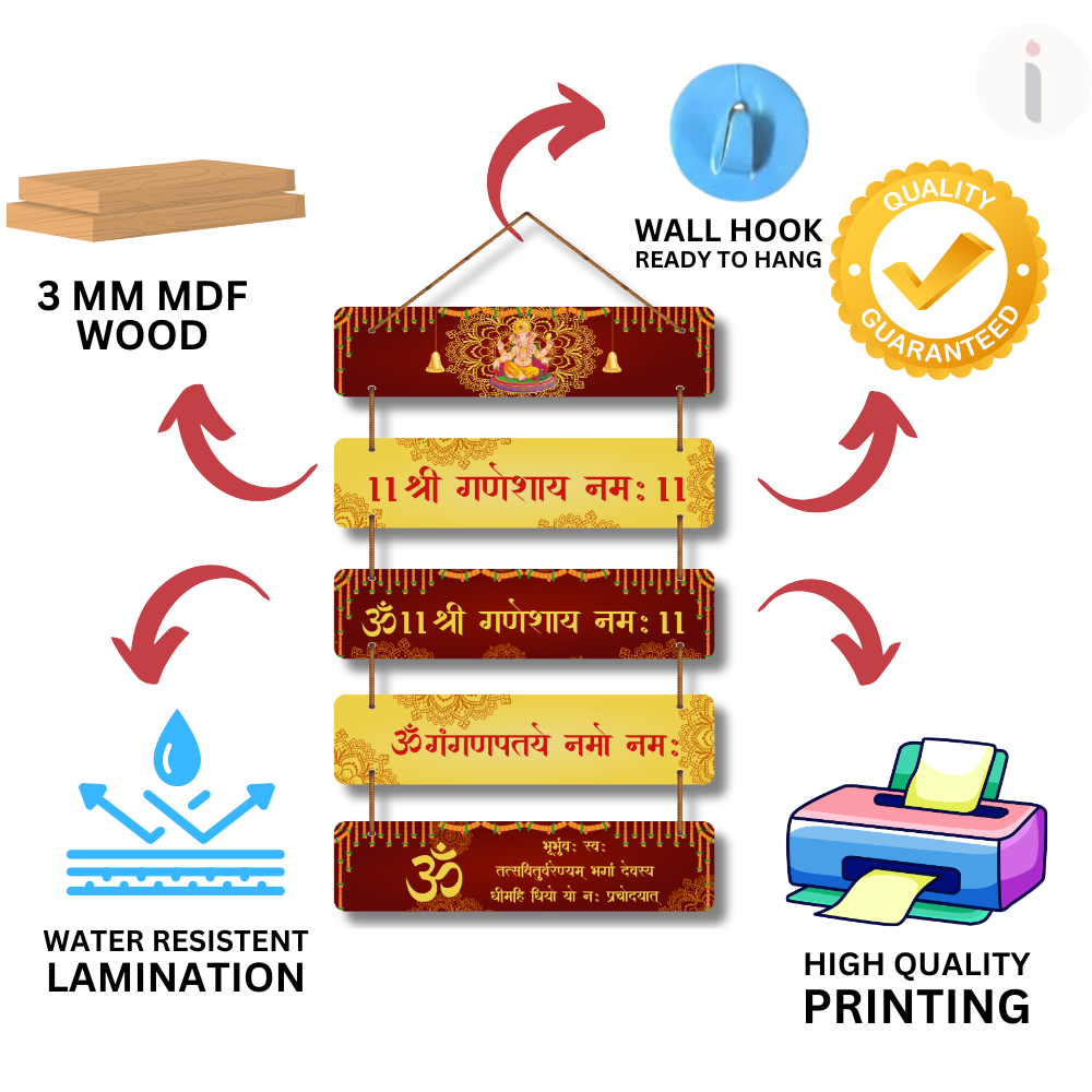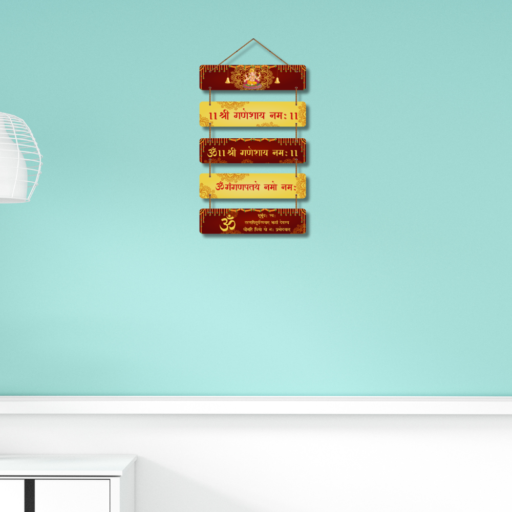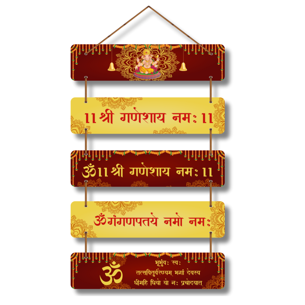 This devotional wall hanging is dedicated to Lord Ganesha, featuring sacred mantras like Shri Ganeshaya Namah and Om Ganapataye Namah. Designed with rich red and golden hues, it symbolizes prosperity, wisdom, and positivity. Perfect for temples, living rooms, or offices, this piece invites divine blessings, removes obstacles, and fills your surroundings with spiritual energy and auspicious vibes.