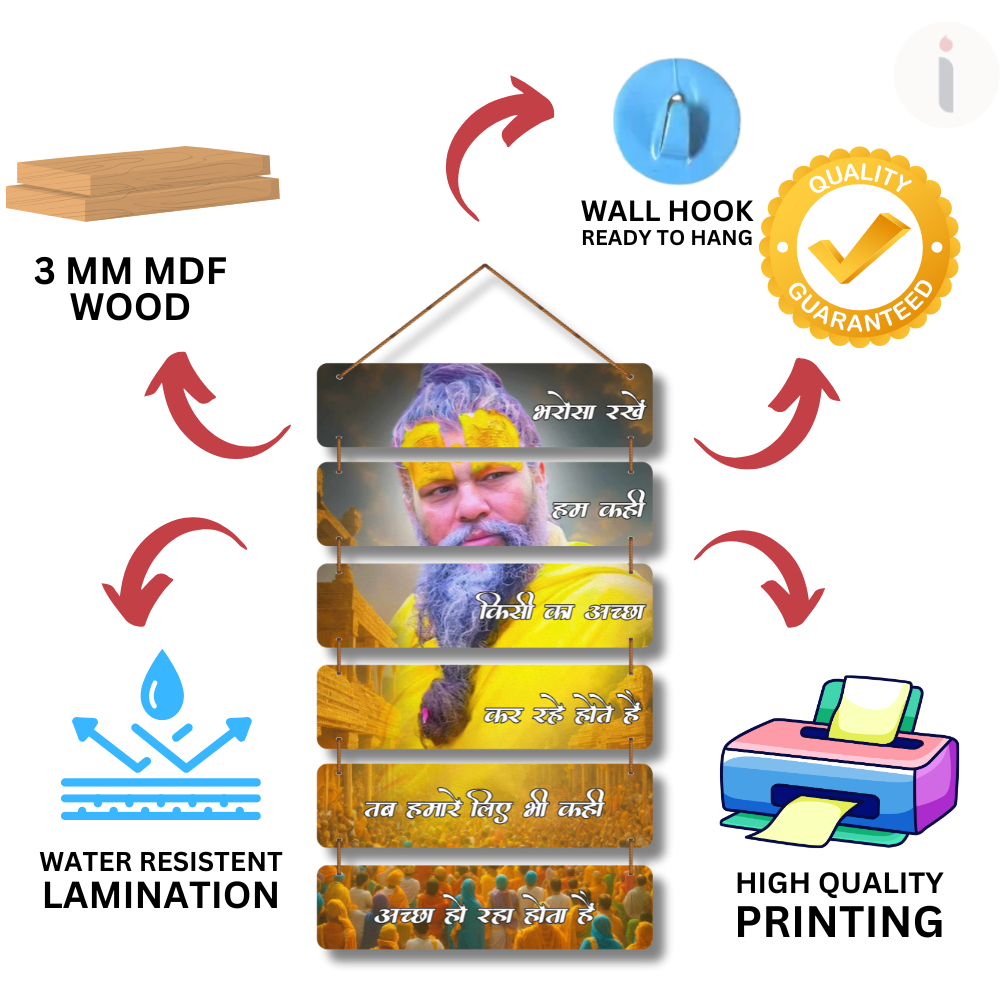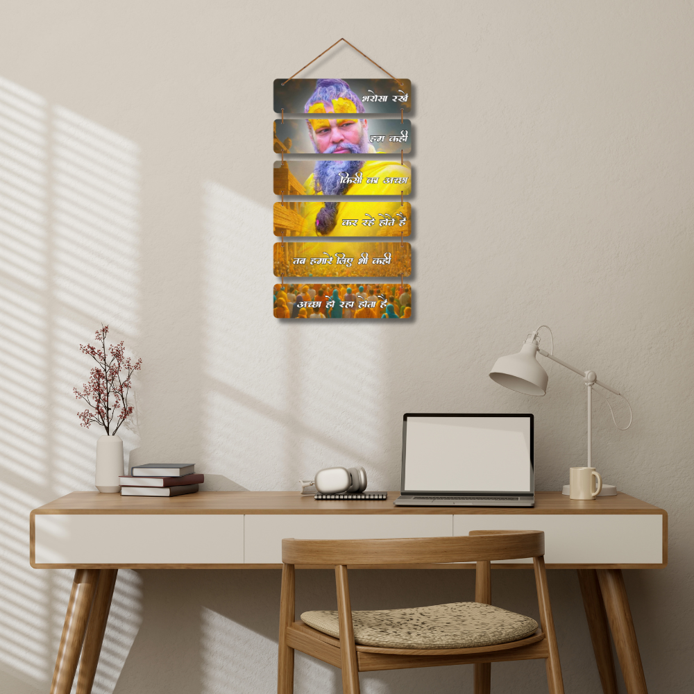 This inspiring wall hanging carries a deep spiritual message in Hindi, reminding us to keep faith, for while we may be working for someone’s good, the universe and God are simultaneously working for ours. With a saintly figure in yellow robes and a devotional aura, it’s perfect for home, temples, or meditation spaces to spread positivity and trust.