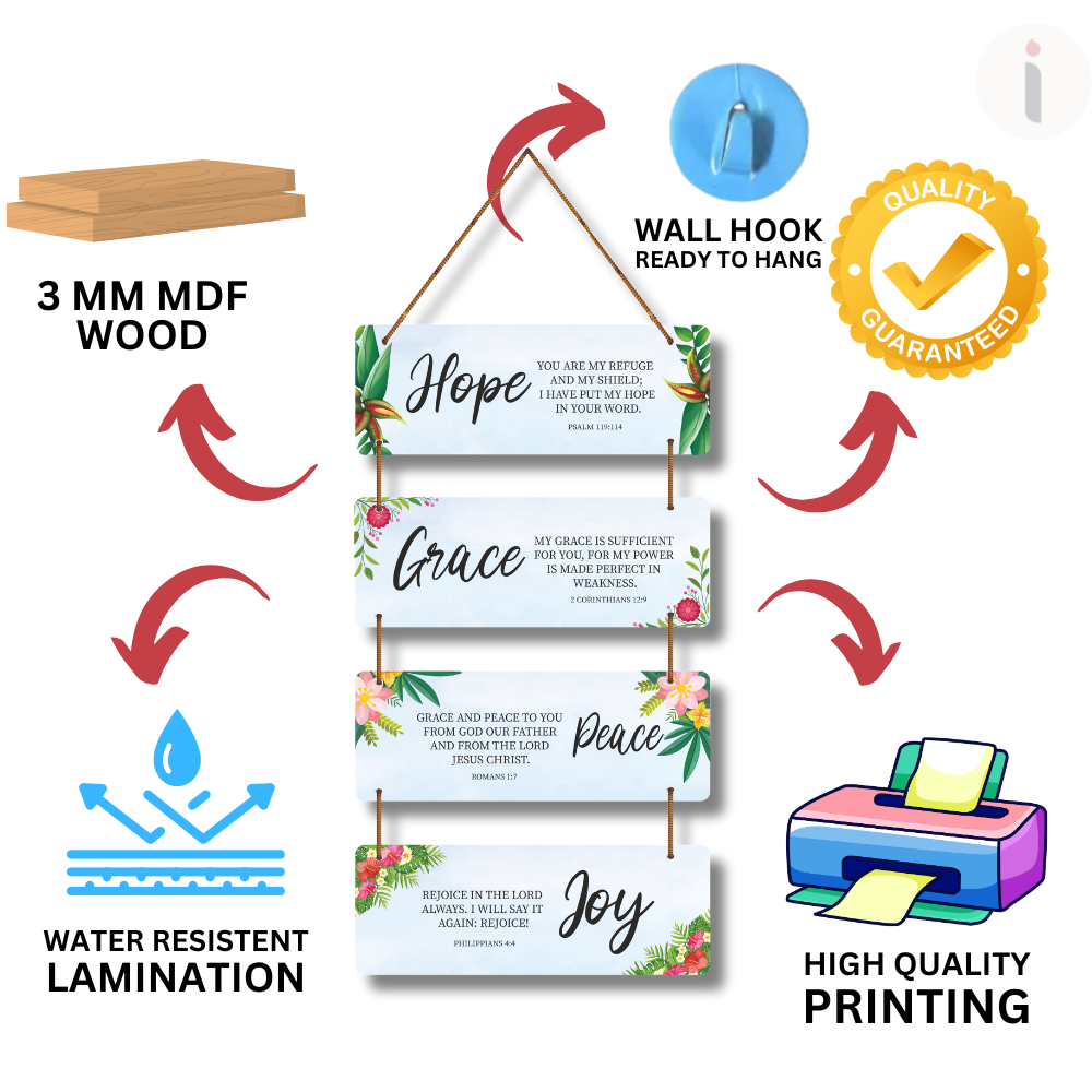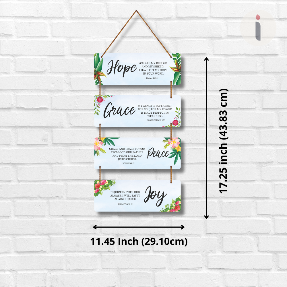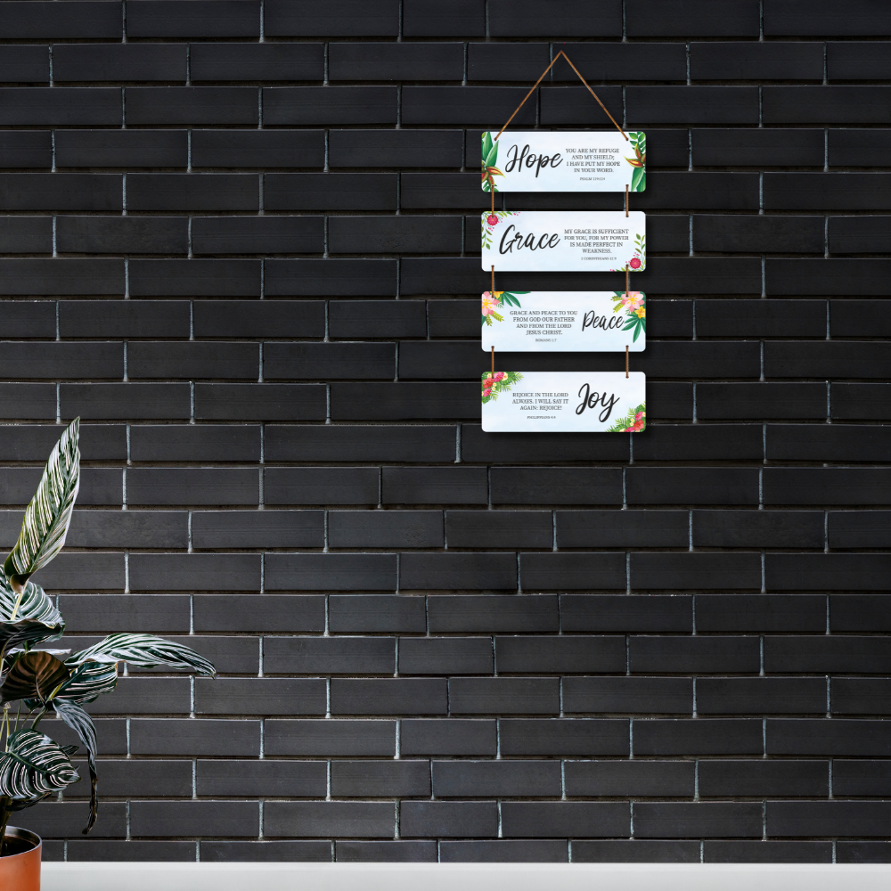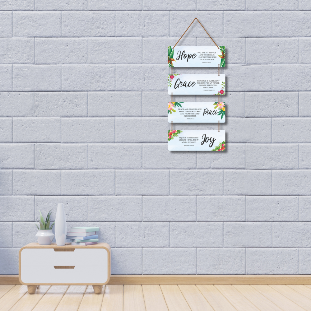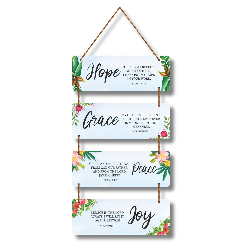 Uplift your space with this inspirational wall hanging featuring Bible verses of faith and positivity. Highlighting Hope, Grace, Peace, and Joy, each plank is adorned with delicate floral accents. Perfect for prayer corners, living rooms, or as a thoughtful gift, it serves as a daily reminder of God’s love, strength, and blessings.