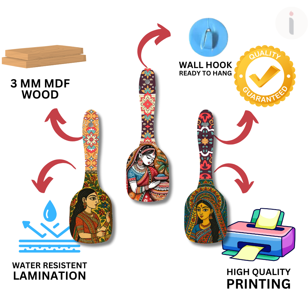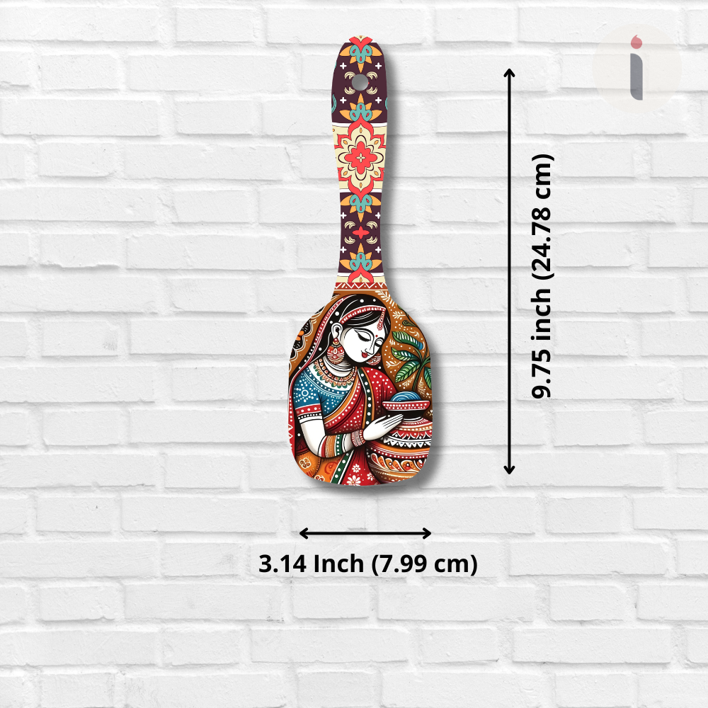 Bring home the charm of Indian tradition with this unique spoon-shaped wall hanging set, adorned with intricate Madhubani art. Featuring graceful women, floral motifs, and vibrant colors, each piece tells a cultural story. Perfect for kitchens, dining areas, or as a thoughtful gift, this décor blends artistic heritage with rustic elegance, adding a touch of tradition to modern homes.