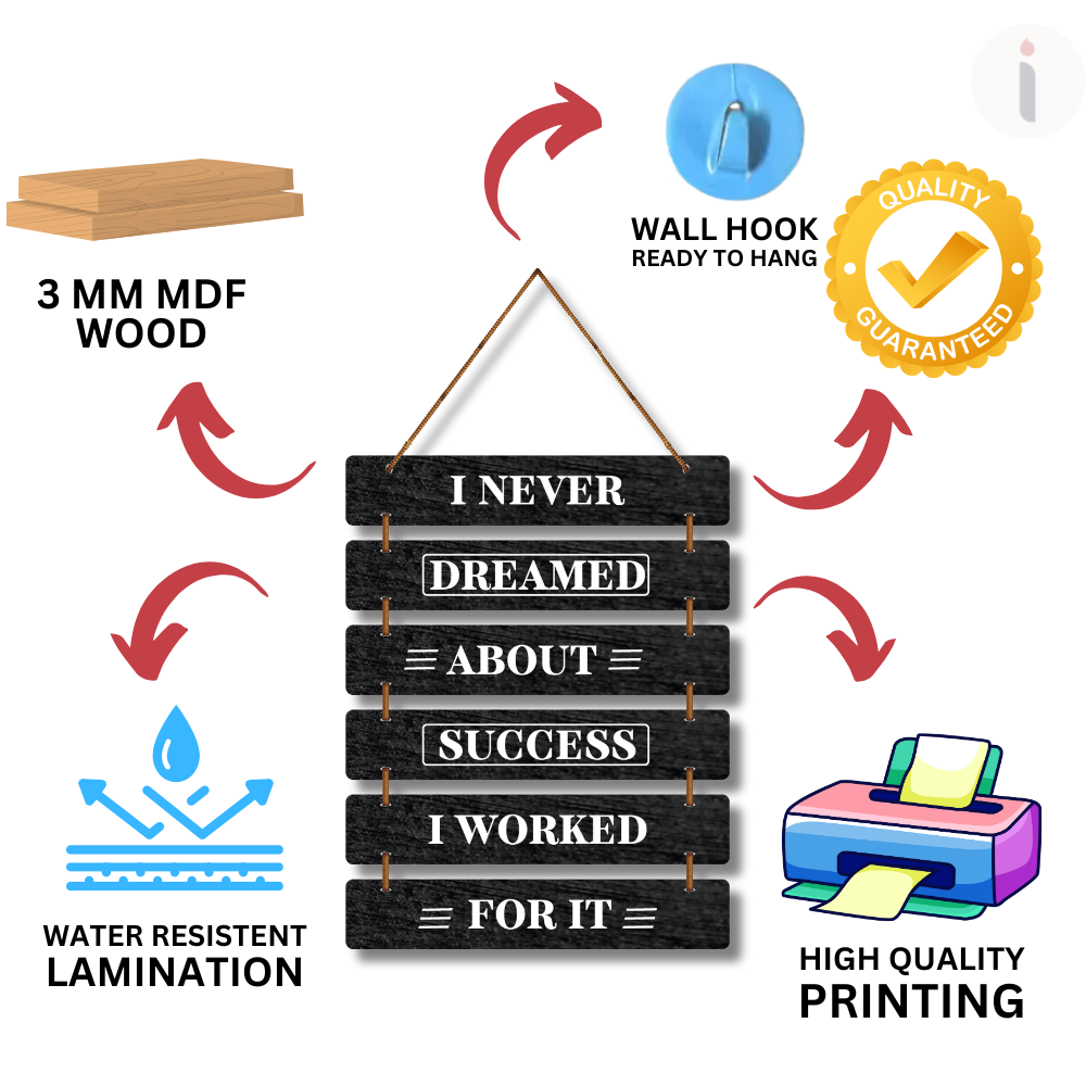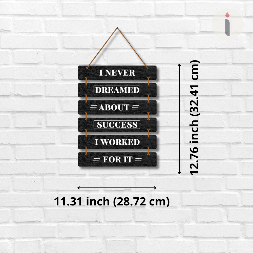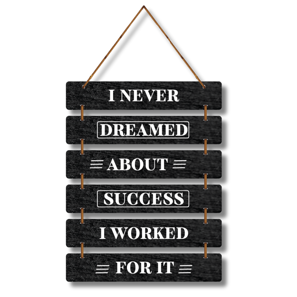 This motivational wall hanging with the quote “I Never Dreamed About Success, I Worked For It” inspires dedication, discipline, and hard work. Designed in a bold black wooden plank style, it adds a strong, focused vibe to any space. Perfect for offices, study rooms, gyms, or workspaces, it serves as a daily reminder to stay committed to your goals.