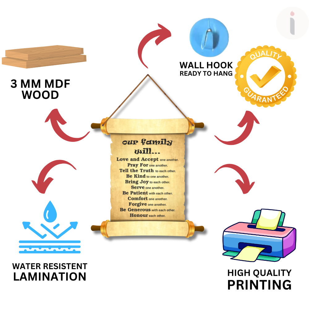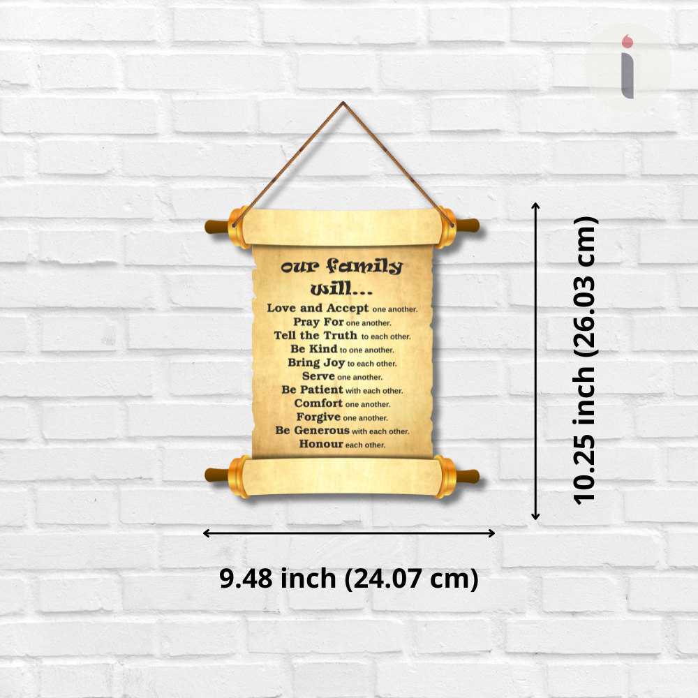 Warmth and inspiration to your home with this vintage scroll-style Family Values wall hanging. Highlighting powerful principles like love, kindness, patience, forgiveness, and truth, it serves as a daily reminder of unity and respect. Perfect for living rooms, entryways, or gifting, this elegant piece blends tradition with meaningful family bonding