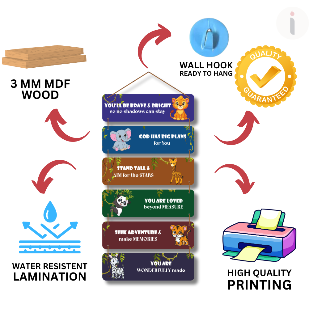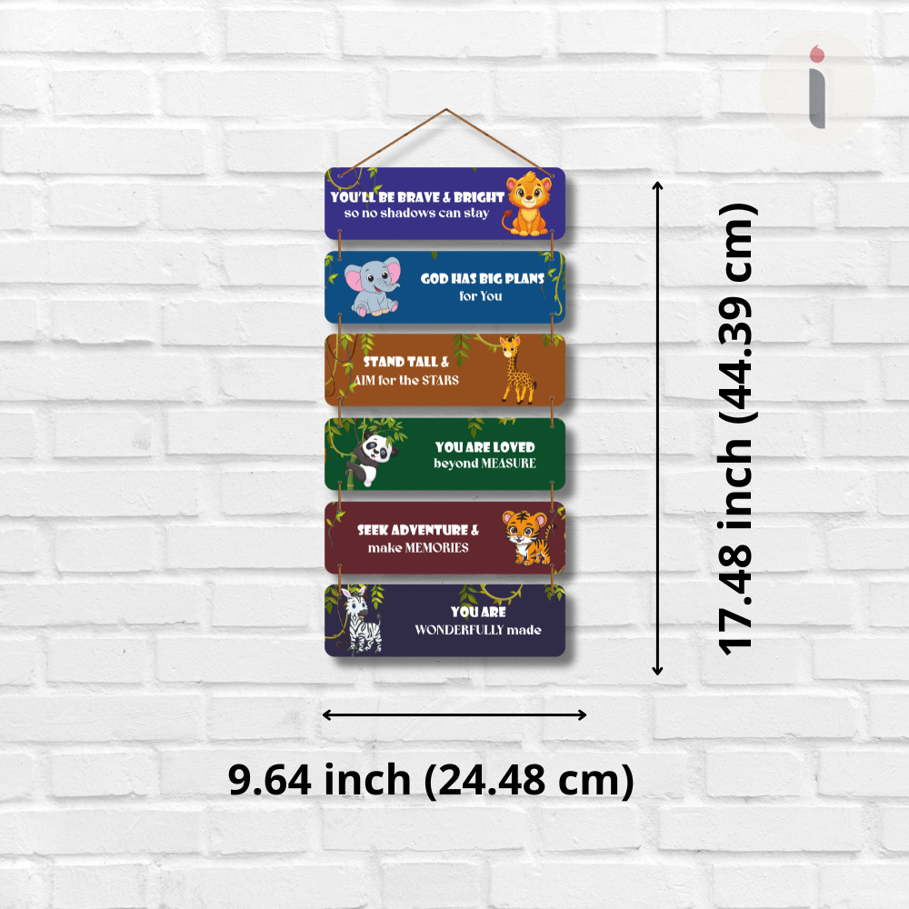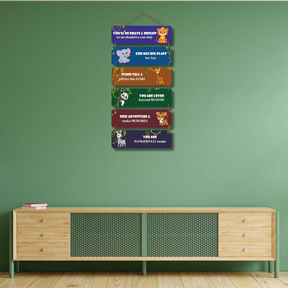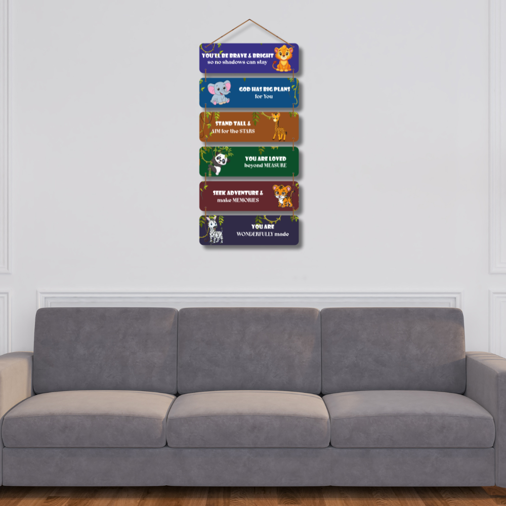 Bring joy, courage, and inspiration to your child’s space with this jungle-themed motivational wall hanging. Featuring adorable animals like lions, elephants, giraffes, pandas, and tigers, each plank carries uplifting messages of bravery, love, adventure, and faith. A colorful and positive décor piece that nurtures self-confidence and happiness in every little heart.