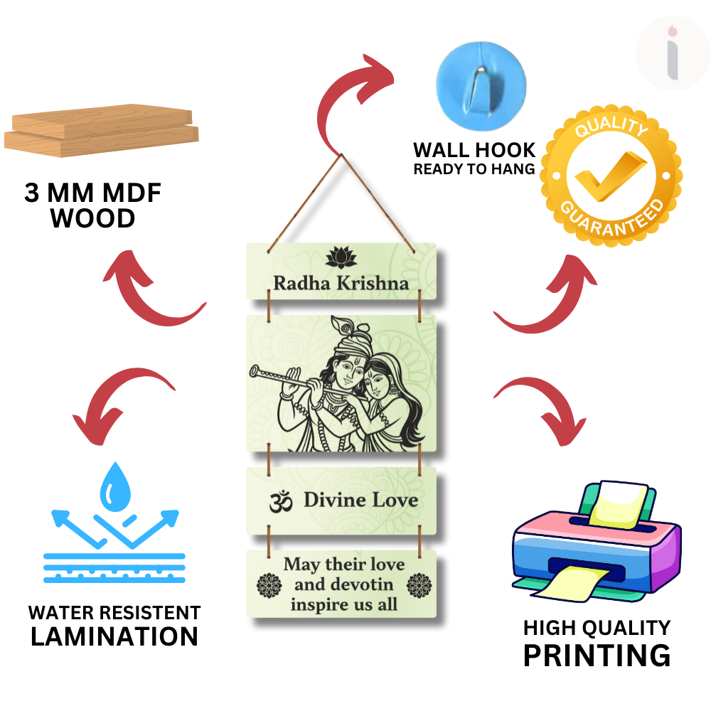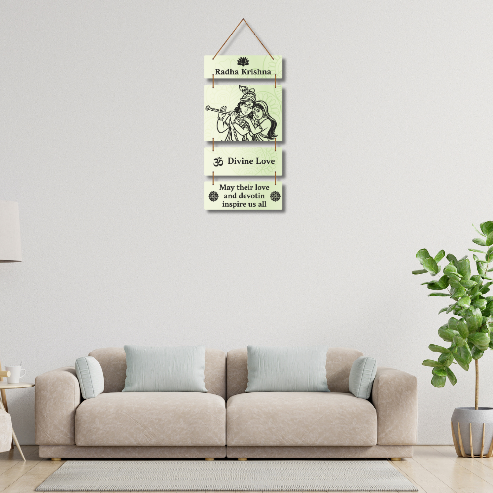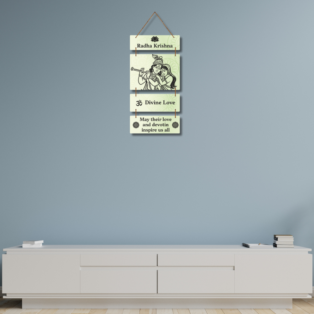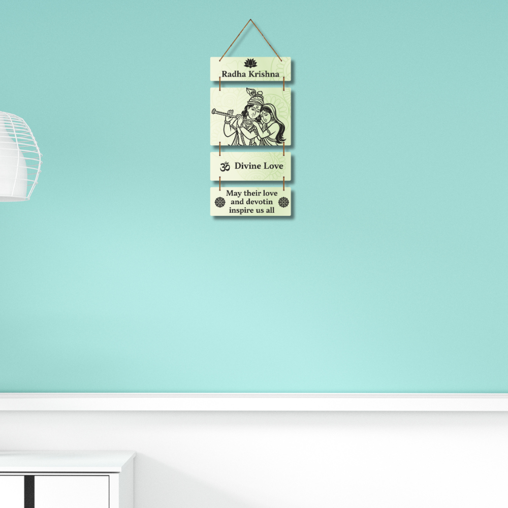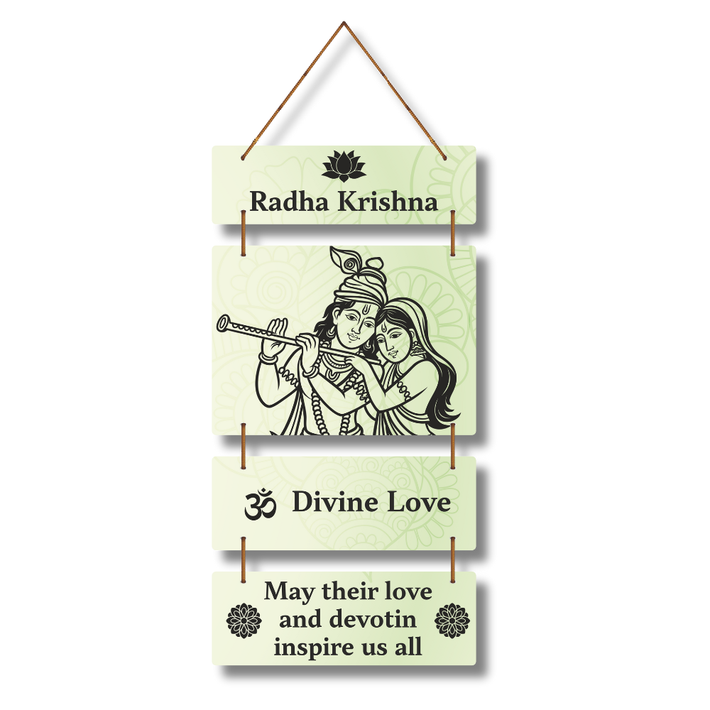 Celebrate eternal love and devotion with this beautifully crafted Radha Krishna wooden wall hanging. Featuring serene artwork with the words “Divine Love – May their love and devotion inspire us all”, it symbolizes harmony, purity, and faith. Perfect for pooja rooms, bedrooms, or gifting, this décor brings peace and spiritual charm into any space.