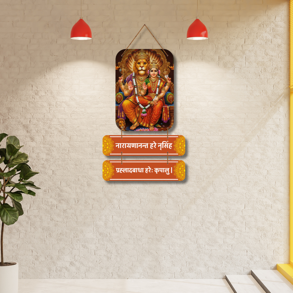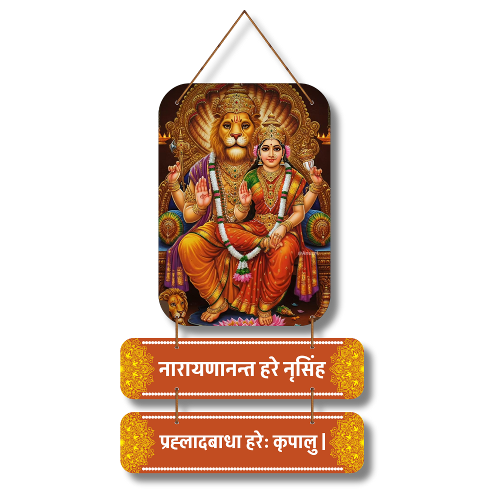 Bring home strength and divine grace with this beautifully crafted Narasimha Swamy wooden wall hanging. Depicting Lord Narasimha with Goddess Lakshmi and adorned with the sacred mantra, it radiates protection, courage, and positivity. Perfect for pooja rooms, meditation spaces, or gifting, this spiritual décor invokes blessings of prosperity, devotion, and fearless living.