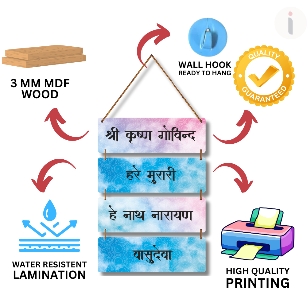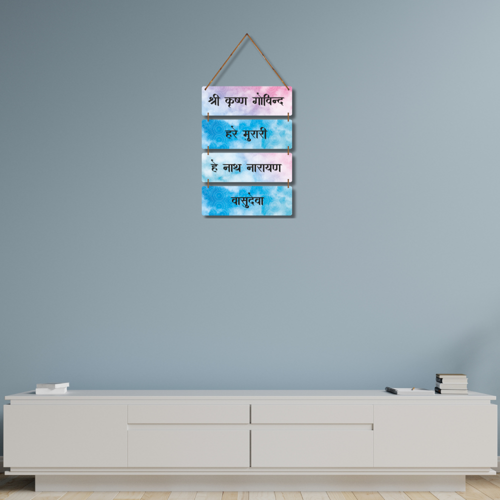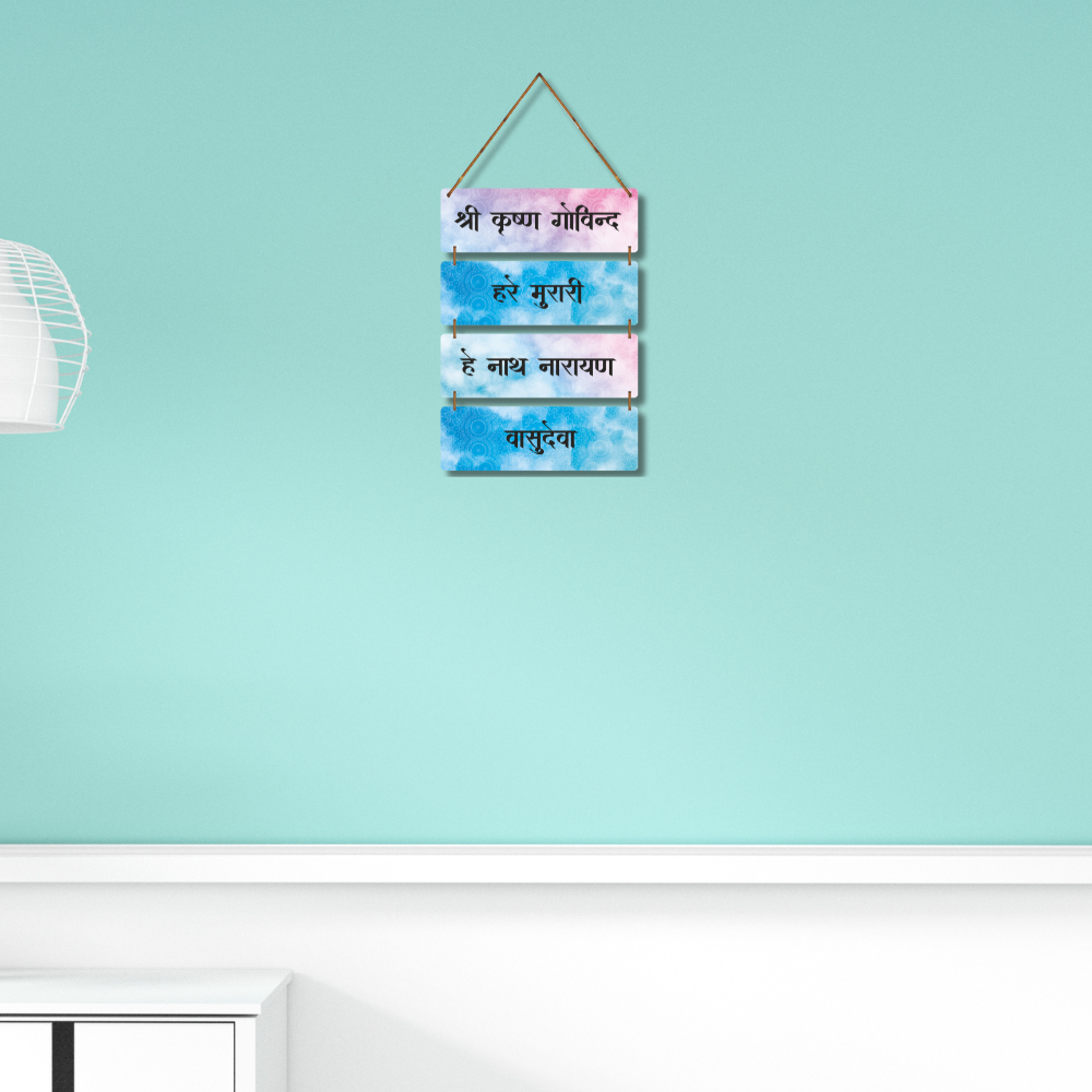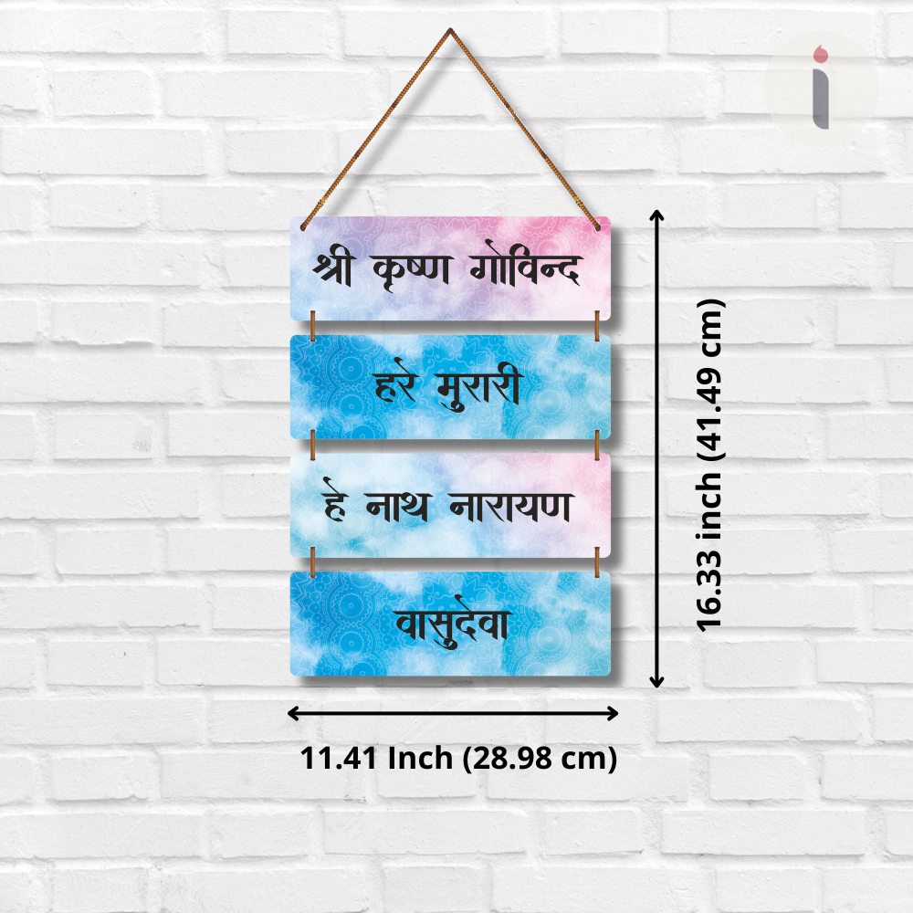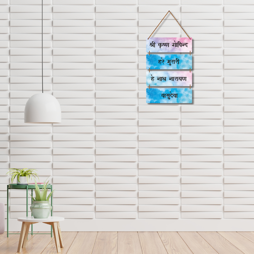 This spiritual wall hanging features the sacred chant “Shri Krishna Govind, Hare Murari, He Nath Narayan, Vasudeva,” radiating peace and devotion. Designed with calming pastel hues and mandala patterns, it adds a divine aura to any space. Perfect for prayer rooms, meditation corners, or living areas, bringing blessings of Lord Krishna into your home.