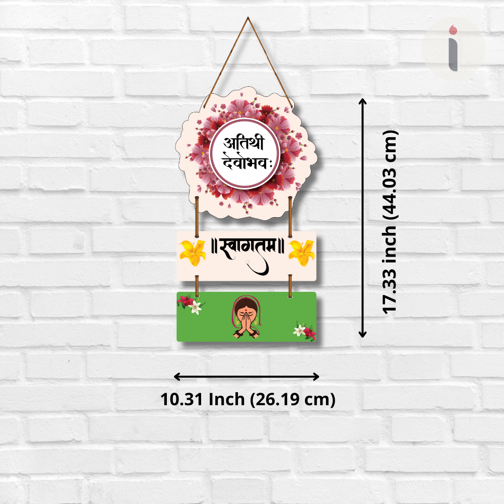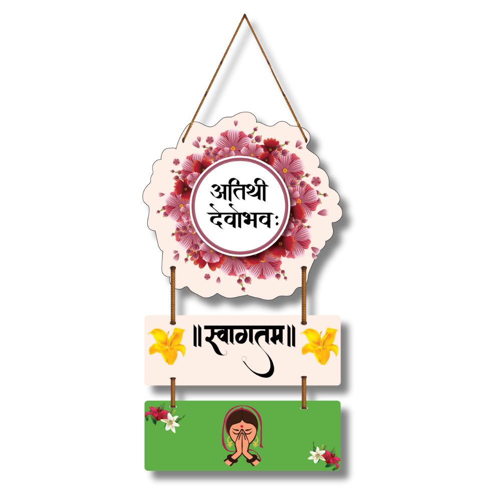 Welcome your guests with warmth and tradition through this elegant wooden wall hanging featuring the Sanskrit phrase “Atithi Devo Bhava” and “Swagatam.” Designed with floral patterns and a Namaste gesture, it reflects Indian culture and hospitality. Perfect for entrance doors, living spaces, or gifting, this piece spreads positivity while reminding that every guest is to be treated like God.