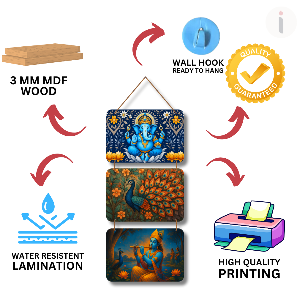 Bring divine beauty and artistic charm into your home with this 3-layer Wooden Wall Hanging featuring Lord Ganesha seated on a lotus, a vibrant peacock symbolizing grace, and Lord Krishna playing the flute in a serene riverside scene. Perfect for temples, living rooms, gifting, or meditation corners, it adds spiritual bliss, cultural elegance, and peaceful energy to any space. 🙏🪔✨