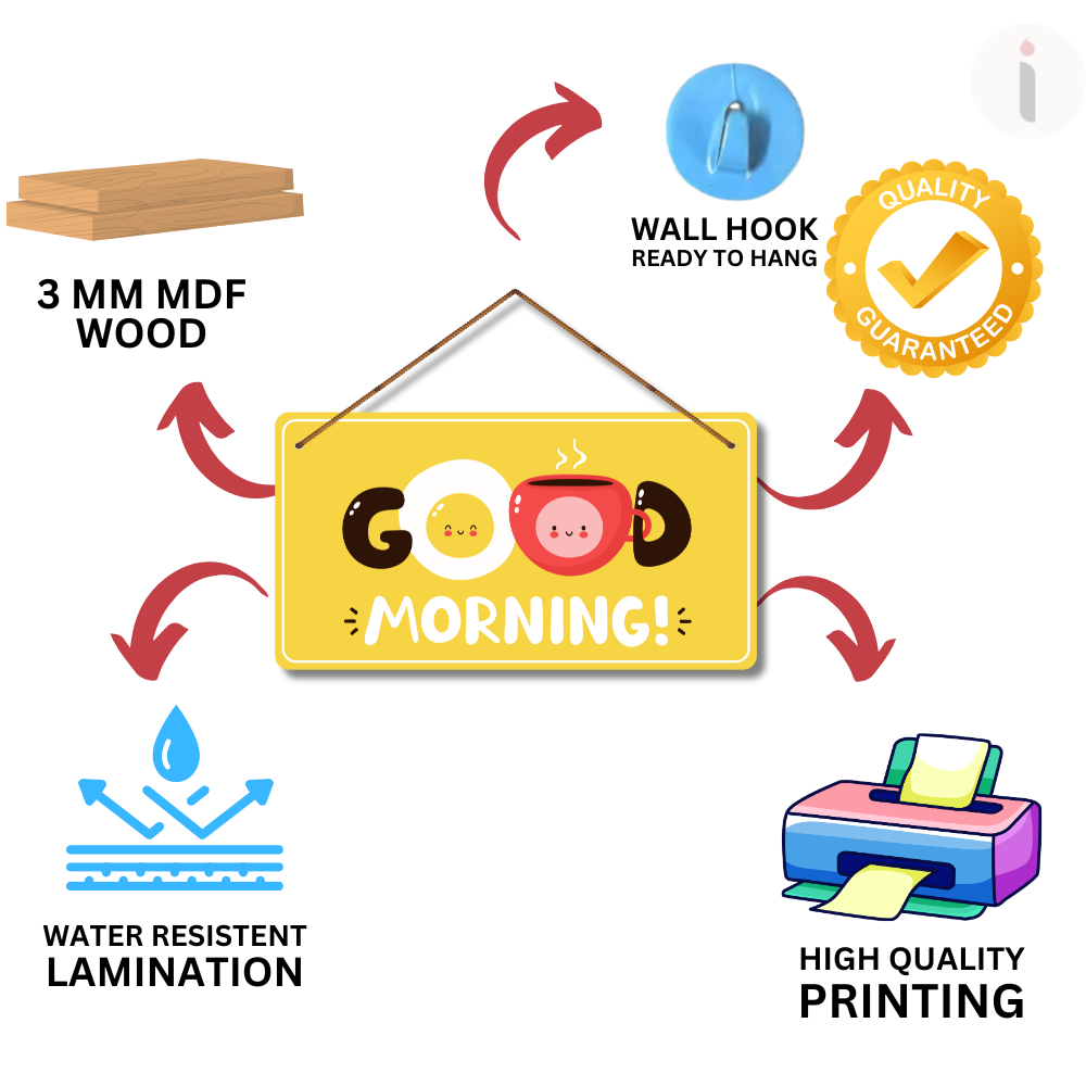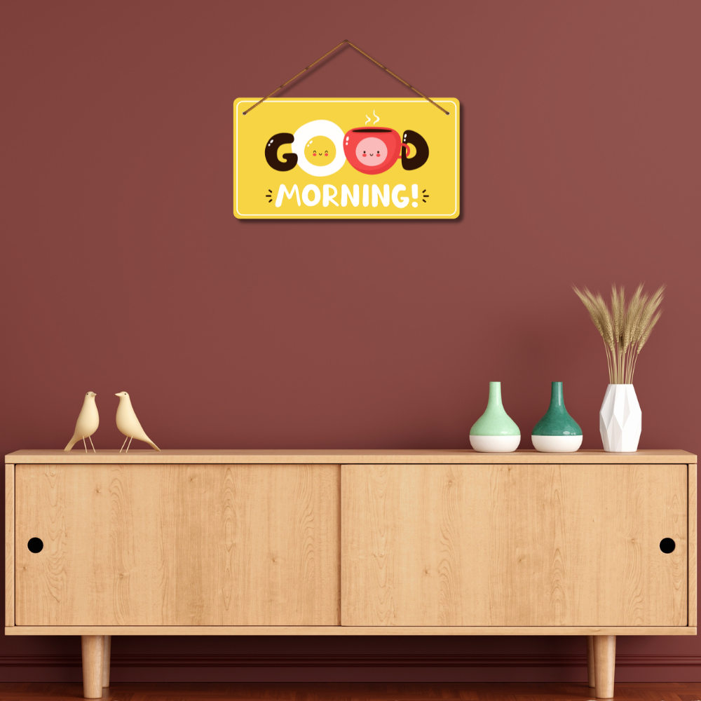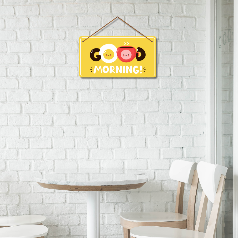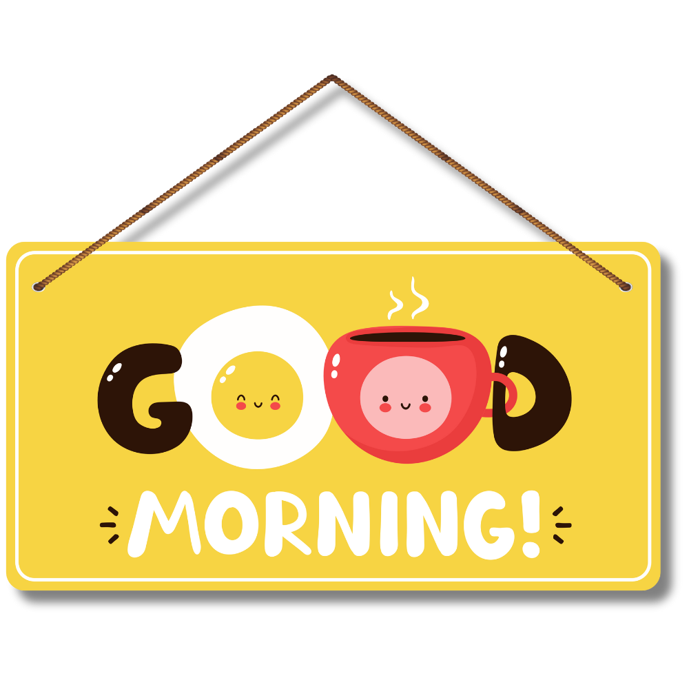 Brighten up your mornings with this cheerful Good Morning wall hanging featuring cute egg and coffee cup illustrations. Its lively yellow background spreads positivity and warmth, making it a perfect piece for kitchens, dining spaces, or cafés. Start every day with a smile and a boost of good vibes!