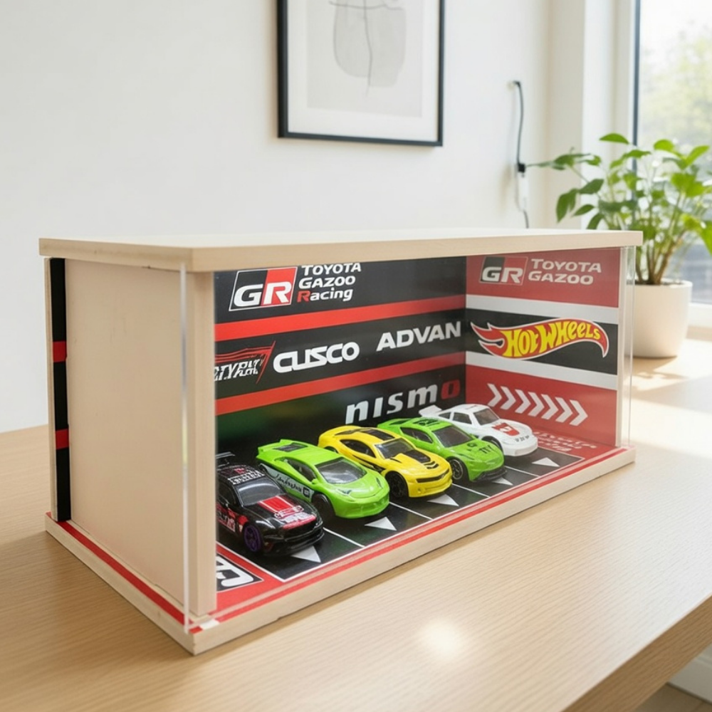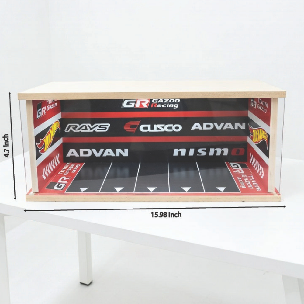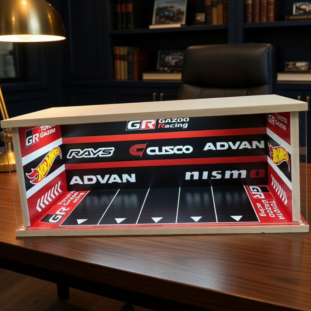 Designed with a garage-inspired backdrop featuring iconic performance elements like GR branding, Advan, Rays, and Cusco-style visuals, it captures the true essence of professional racing culture. The structured parking layout gives your diecast cars a clean yet aggressive “track-ready” stance. ✨
