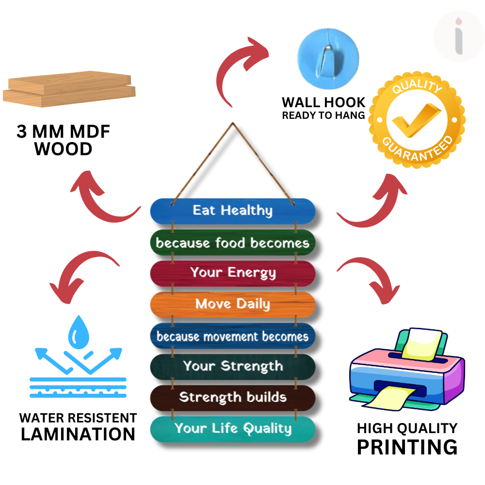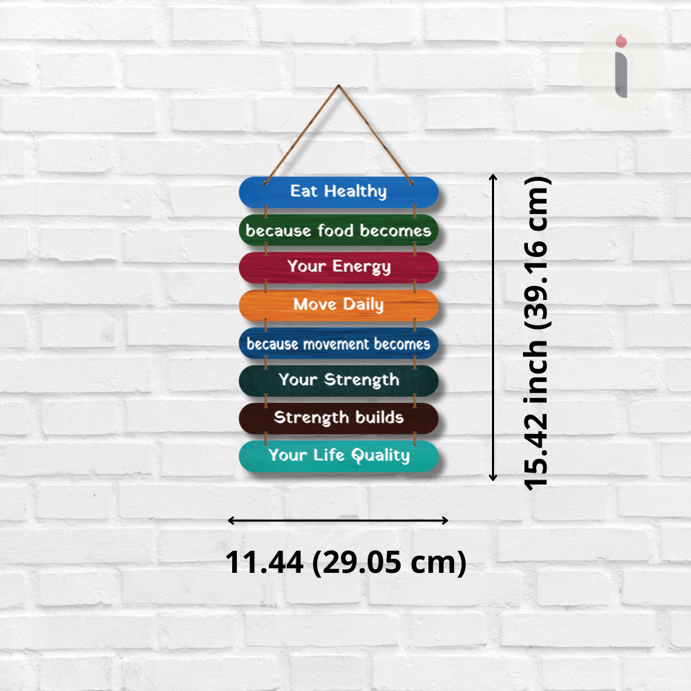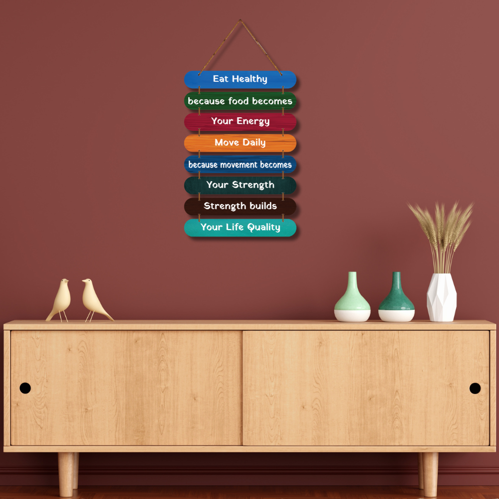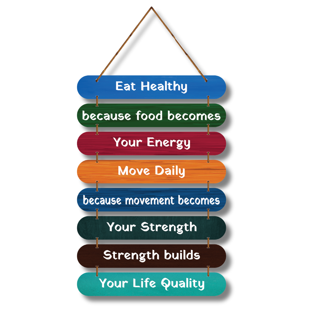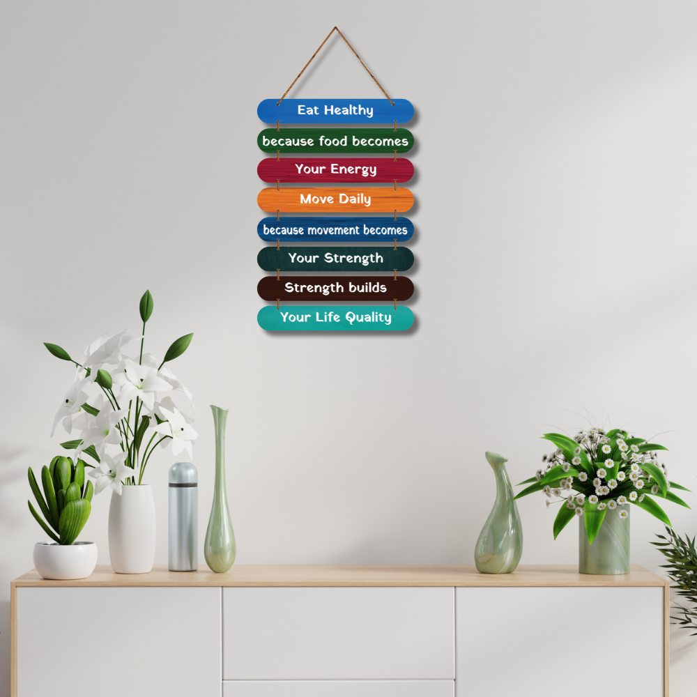 Bring positivity into your everyday routine with this vibrant “Eat Healthy – Move Daily” motivational wooden wall hanging. Featuring colorful layered planks and inspiring lines, it reminds you that food fuels energy, movement builds strength, and strength improves life quality. Perfect for kitchens, gyms, wellness spaces, cafés, workplaces, or homes to inspire a healthier lifestyle every day. 🌿💪✨