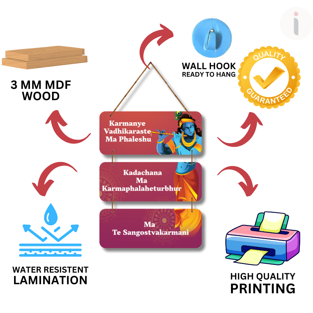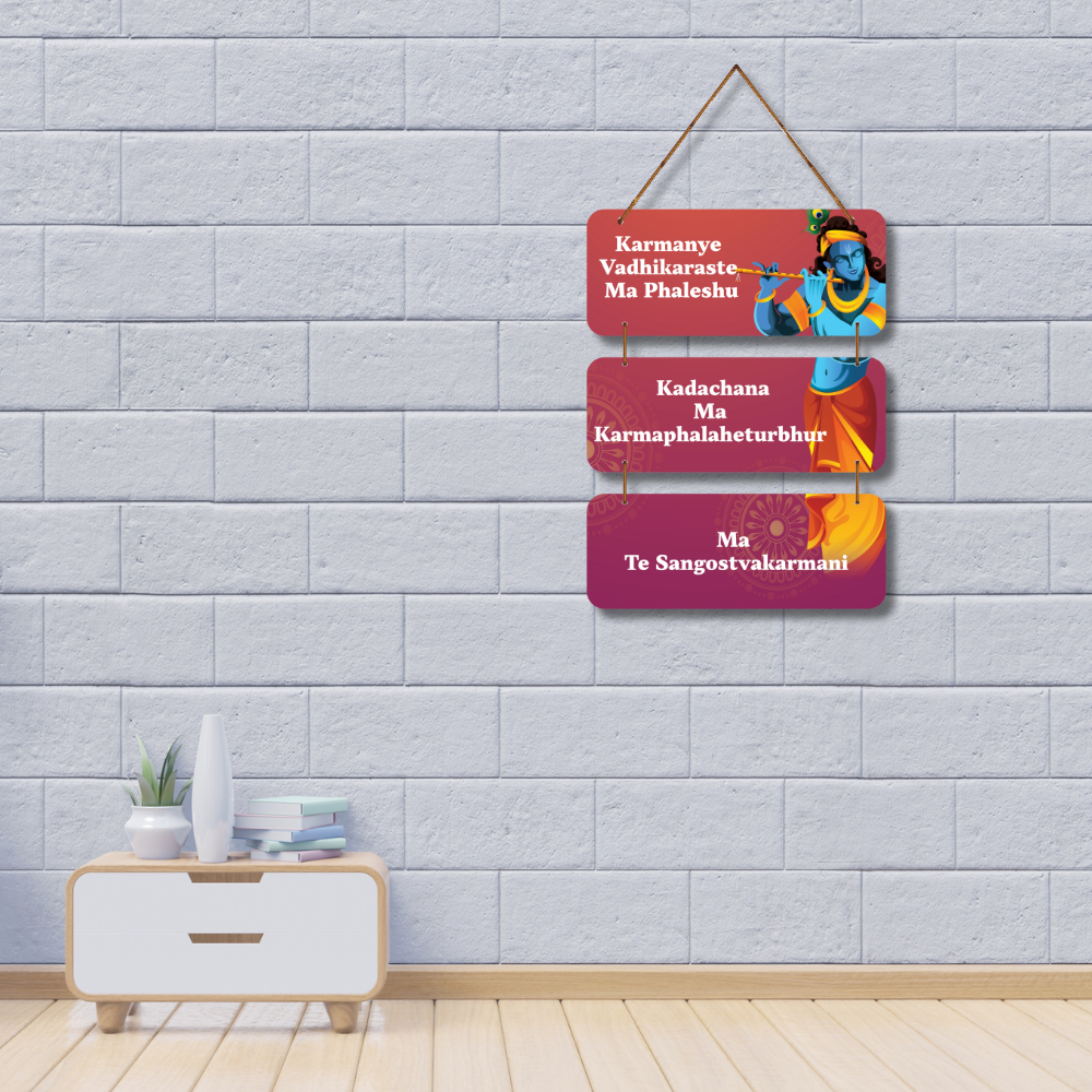 Inspire wisdom and mindfulness with this beautiful Bhagavad Gita wooden wall hanging. Featuring the powerful verse “Karmanye Vadhikaraste Ma Phaleshu…”, it reminds us to focus on our actions without attachment to results. Perfect for pooja rooms, meditation spaces, or gifting, this décor piece brings spiritual guidance, positivity, and divine blessings into your home.