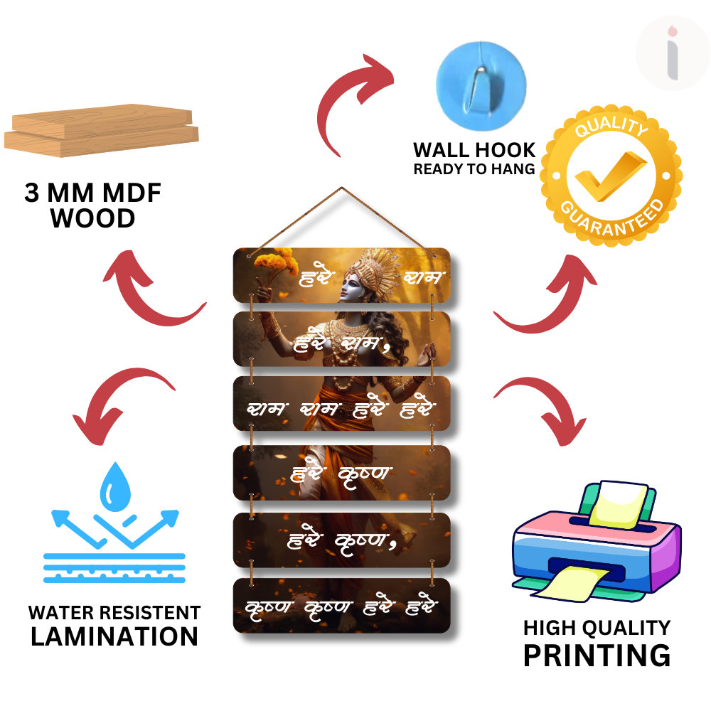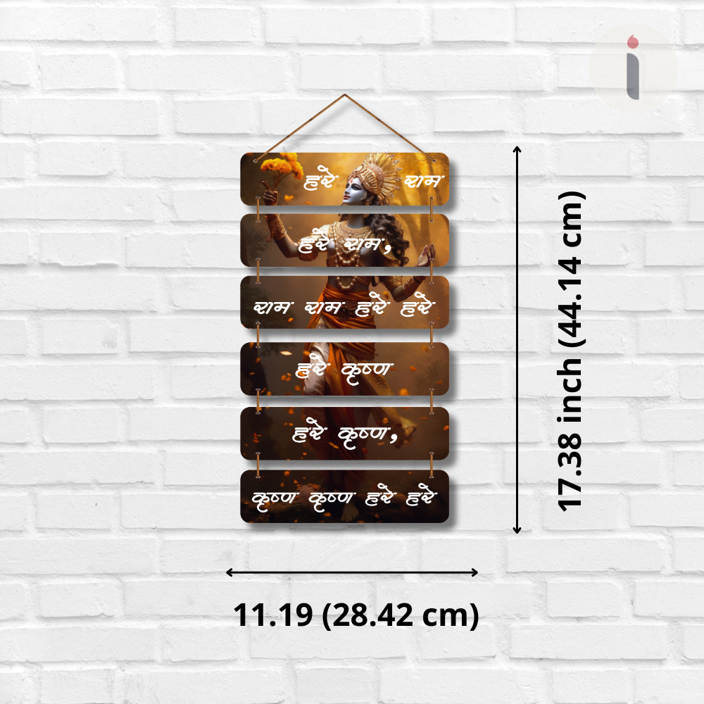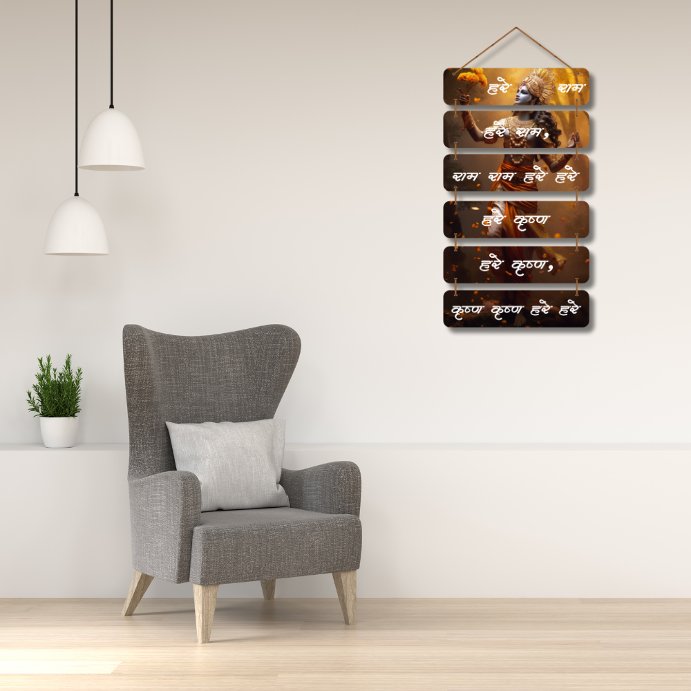Celebrate divine devotion with this Hare Shyam Hare Krishna wall hanging featuring a stunning artistic depiction of Lord Krishna. Each wooden plank displays sacred chanting in elegant white text over warm, glowing backgrounds. A perfect spiritual décor piece for temples, pooja rooms, meditation corners, or gifting, bringing serenity, positivity, and blessings into any space. 🙏✨