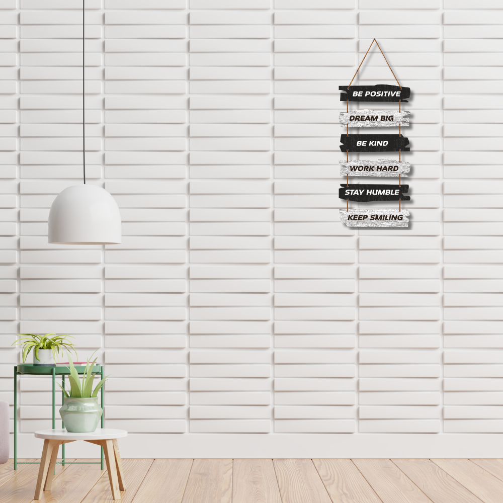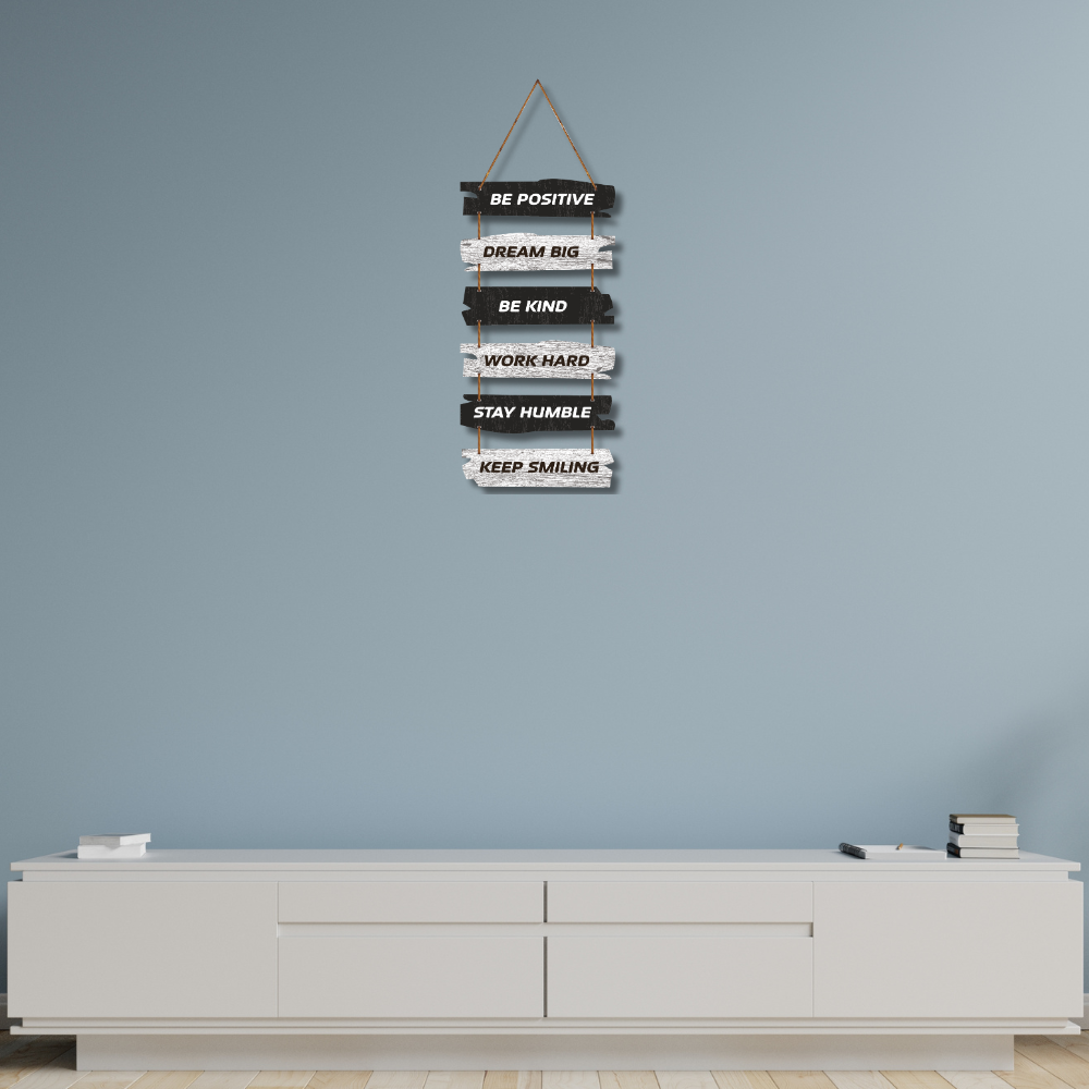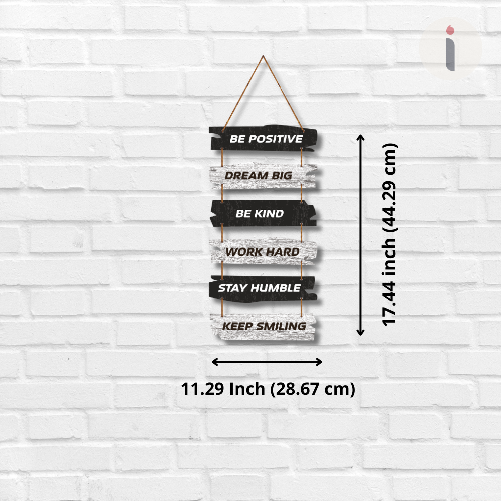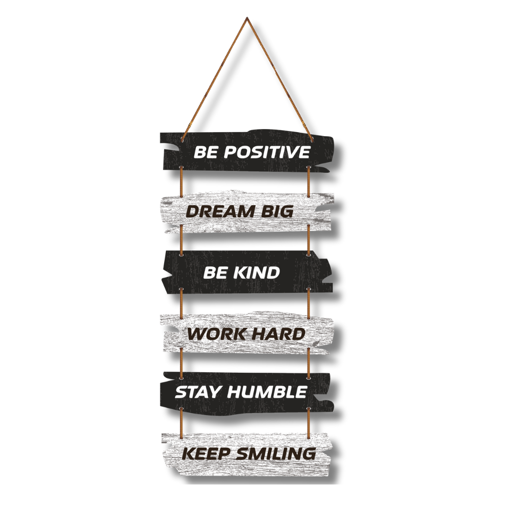 This motivational wooden wall hanging features powerful reminders like Be Positive, Dream Big, Be Kind, Work Hard, Stay Humble, and Keep Smiling. Perfect for homes, offices, or study spaces, it spreads positivity and encouragement daily. Its rustic black-and-white design adds charm while keeping you inspired to live with kindness, determination, and a cheerful spirit every day.