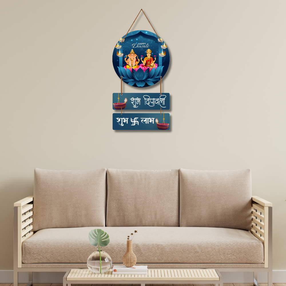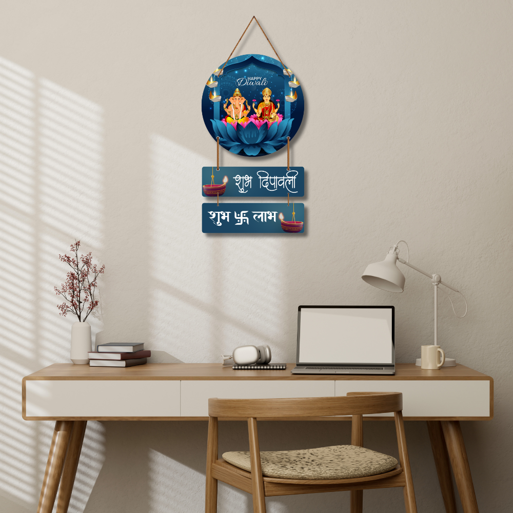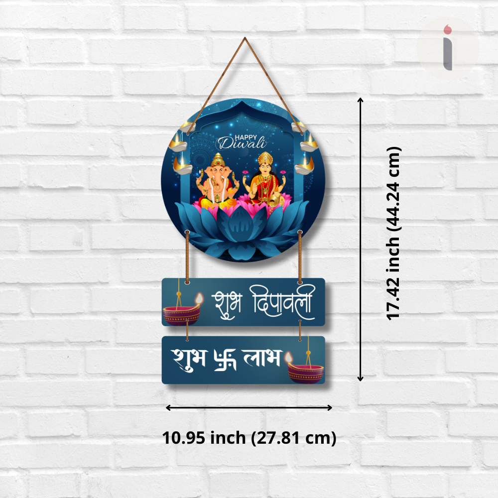Festive charm to your home with this elegant Diwali wall hanging featuring Lord Ganesha and Goddess Lakshmi. Symbolizing prosperity, wisdom, and blessings, it’s beautifully adorned with diyas and lotus motifs. Perfect for your entrance, pooja room, or gifting, this piece brings warmth, positivity, and auspicious vibes to your Diwali celebrations.