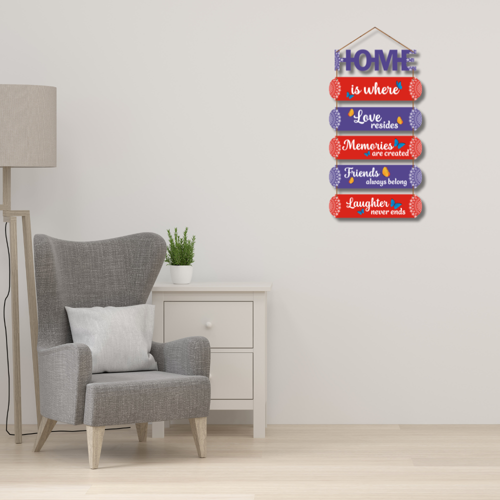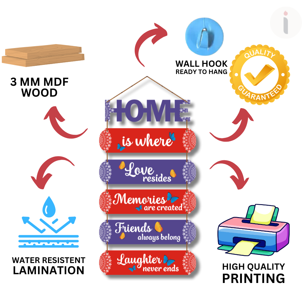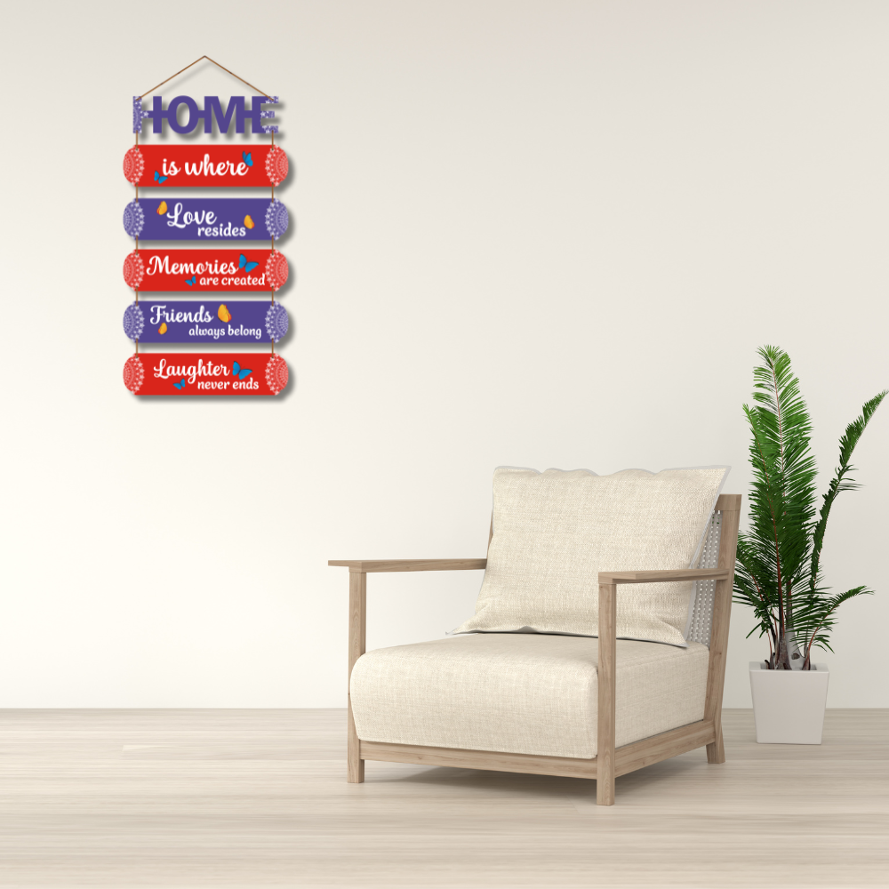 Bring warmth and positivity to your home with this vibrant hanging board décor. Designed in bold red and purple tones, it features uplifting quotes like “Home is where love resides” and “Laughter never ends,” surrounded by butterflies and mandala art. Perfect for living rooms, entryways, or gifting to loved ones for a cozy, joyful home atmosphere.