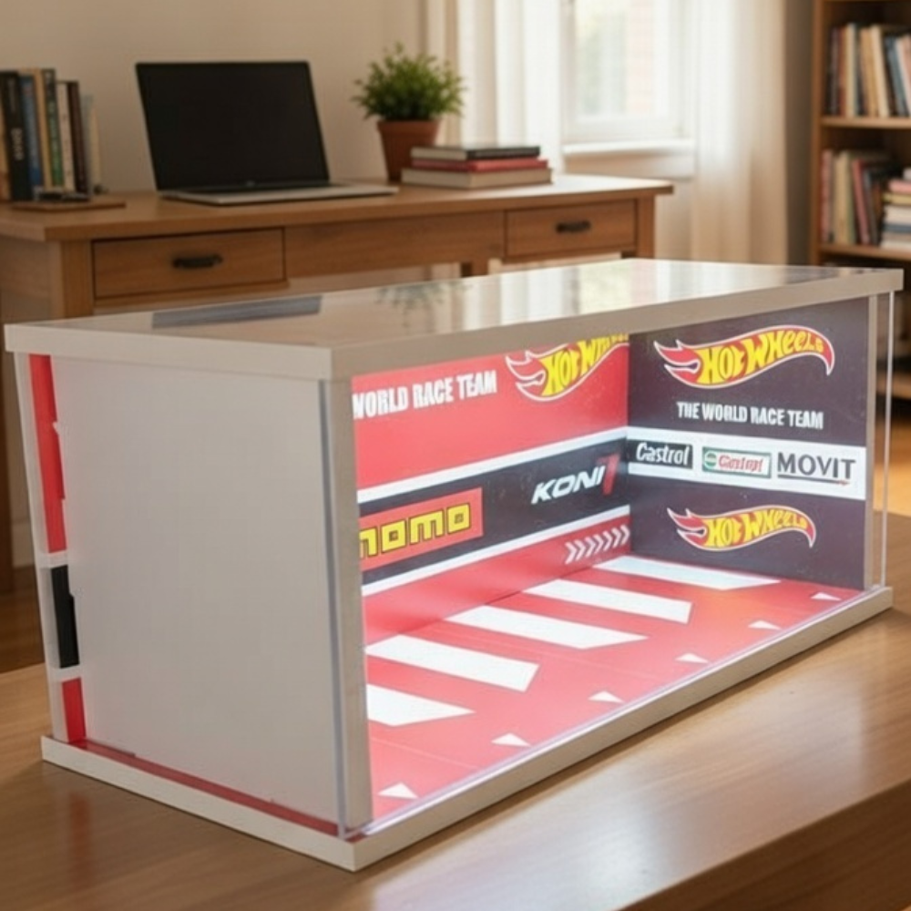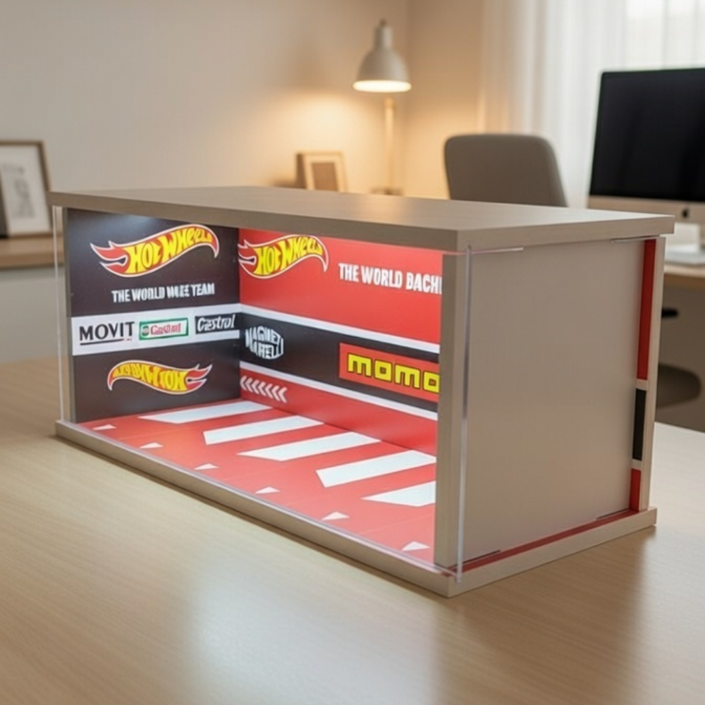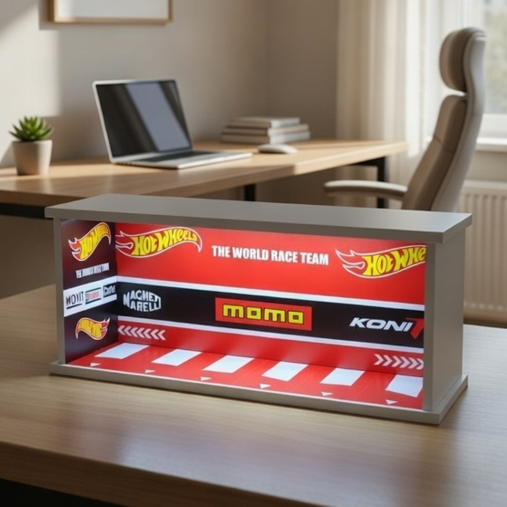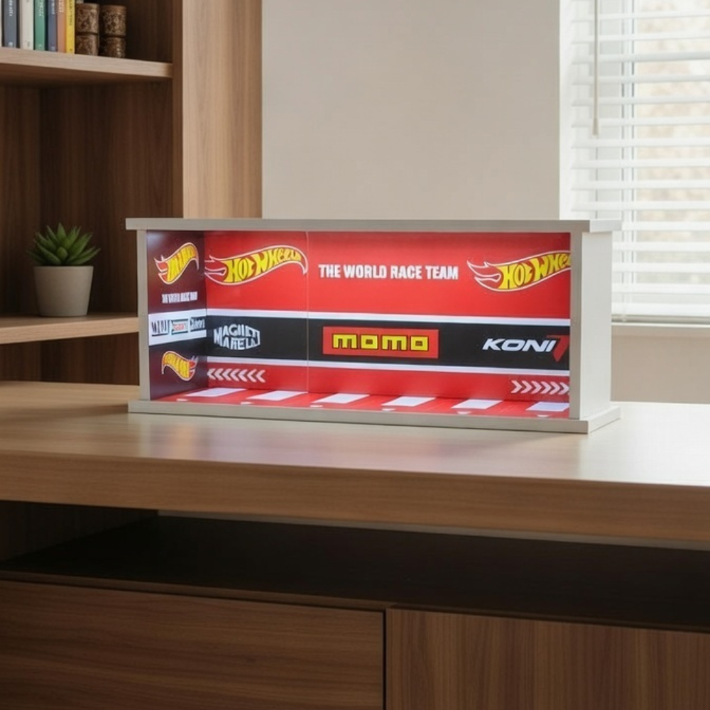 The Hot Wheels Luxury Car Diorama is a bold, race-inspired display crafted for true speed lovers and collectors. Featuring iconic red racing graphics, sponsor-style detailing, and bright LED illumination, this diorama recreates the adrenaline of a world-class pit lane. Its vibrant design instantly grabs attention, transforming any desk or shelf into a miniature motorsport arena. Precision lines and dynamic visuals make every model car look ready for the next race. ποΈπ₯