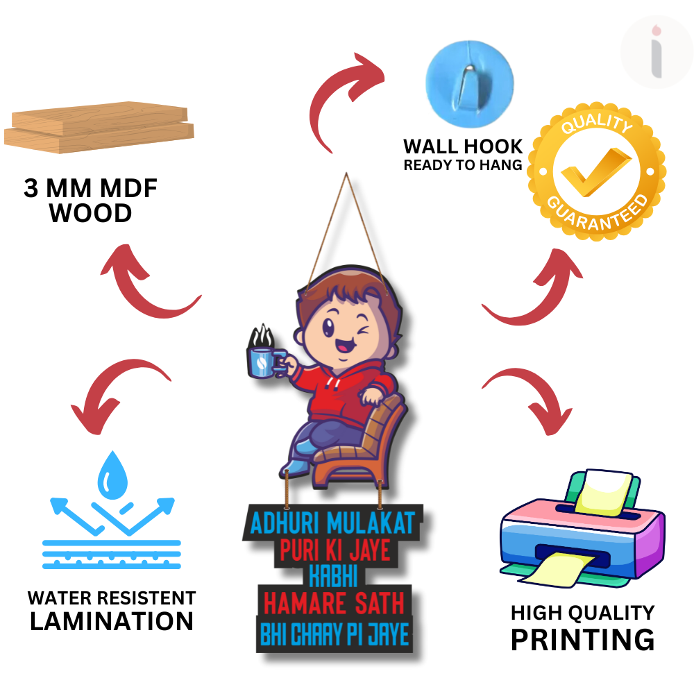 This quirky wall hanging featuring a cute character and the relatable quote “Adhuri Mulakat Puri Ki Jaye, Kabhi Hamare Sath Bhi Chaay Pijiye” is a perfect conversation starter! Ideal for your kitchen, café corner, or living room, it adds humor, warmth, and desi charm to your space—because every good bond begins over a cup of chai.