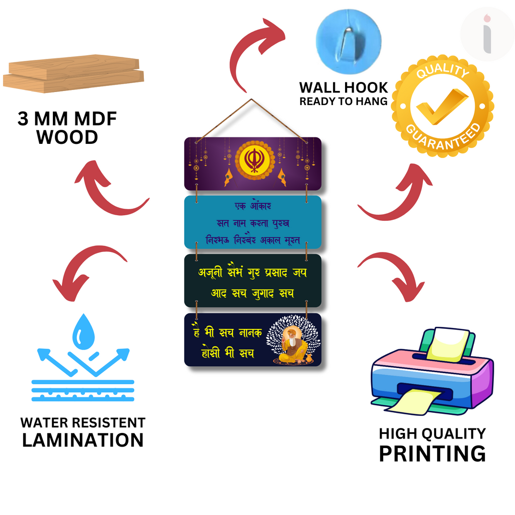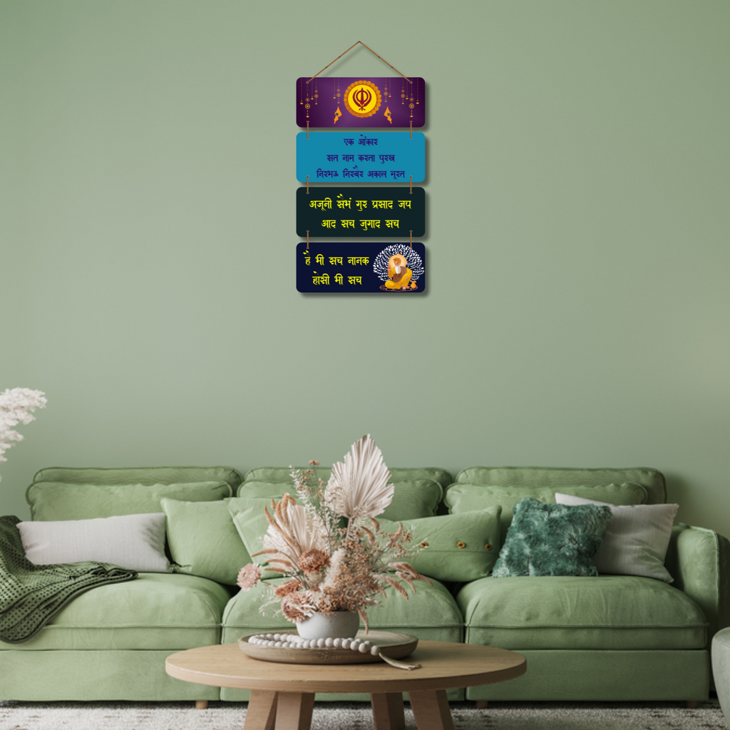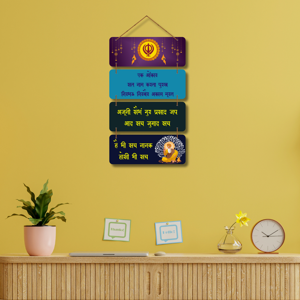 Embrace spiritual serenity with this divine wall hanging featuring the sacred Mool Mantar from Guru Granth Sahib. Adorned with the Khanda symbol and the image of Guru Nanak Dev Ji, it brings peace, positivity, and a reminder of timeless truth — Ik Onkar, Satnam. Perfect for pooja rooms, entryways, or spiritual corners.