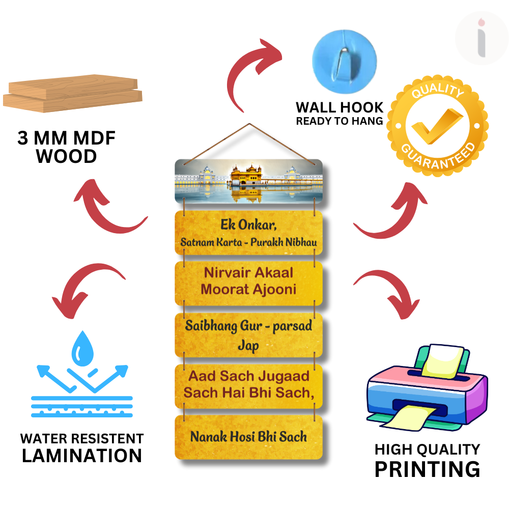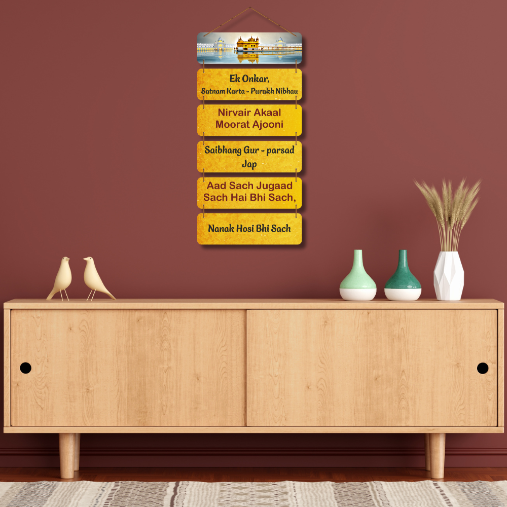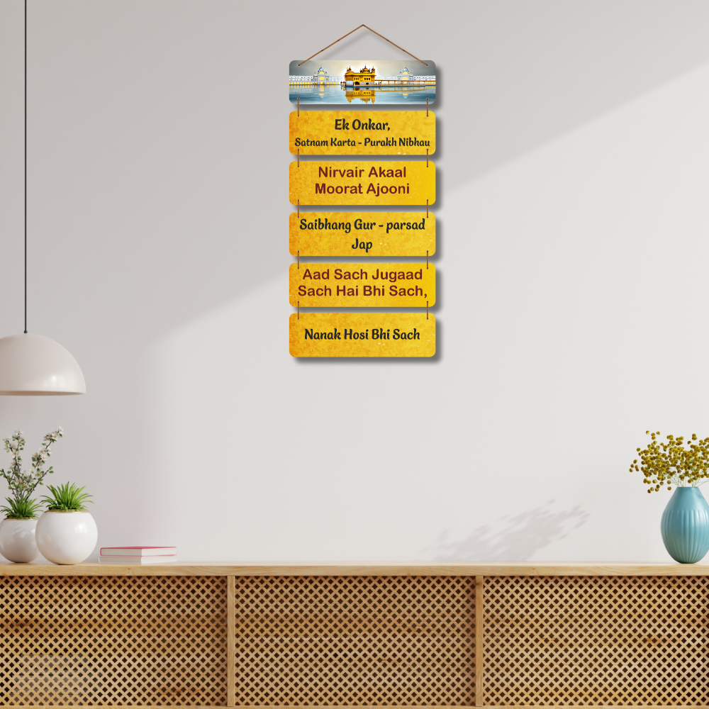 This spiritual wall hanging beautifully displays the sacred verses Ek Onkar with a serene illustration of the Golden Temple on top. Designed in golden hues, it symbolizes peace, divinity, and eternal truth. Perfect for prayer rooms, living areas, or gifting, this piece inspires daily mindfulness while adding a sacred and devotional touch to your home décor.