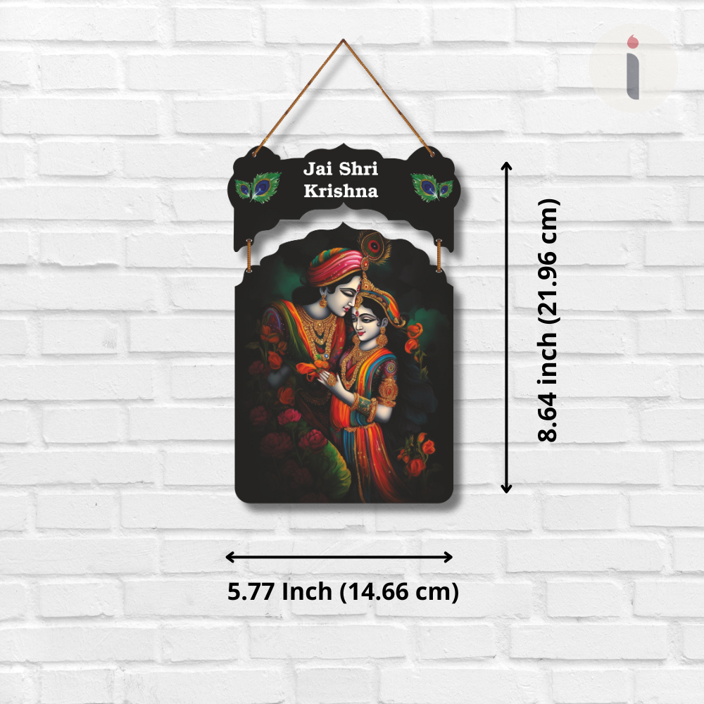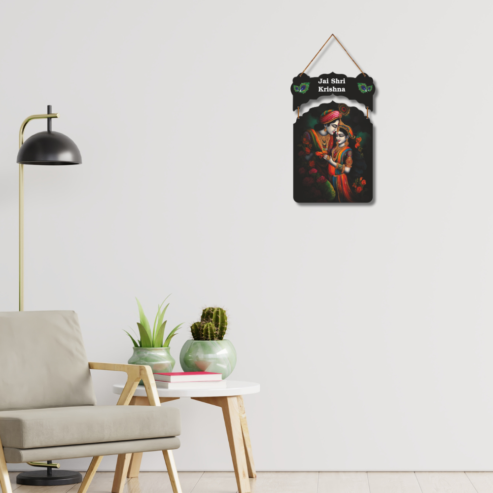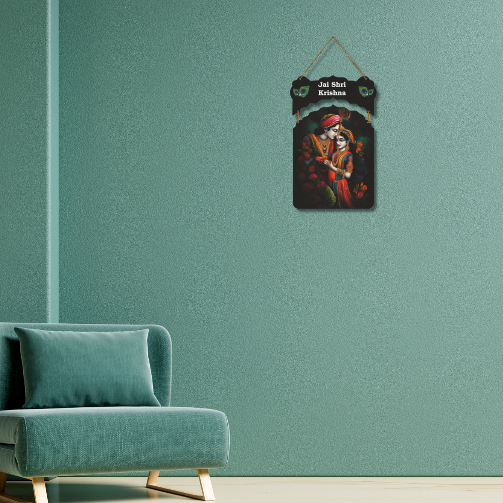 Bring divine grace to your home with this beautiful Jai Shri Krishna wall hanging, featuring a stunning artwork of Radha and Krishna in vibrant colors. Adorned with peacock feather motifs, it radiates spiritual charm and positivity. Perfect for living rooms, temples, or gifting, this wall hanging adds a touch of devotion, love, and elegance to any space.