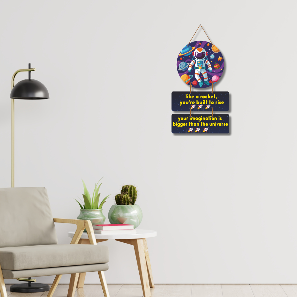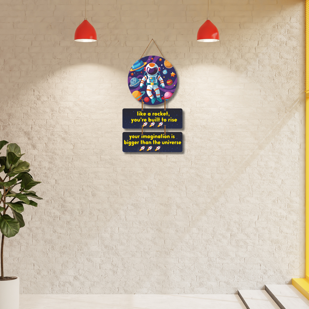 Fuel your dreams and imagination with this vibrant astronaut-themed wall hanging. Featuring the inspiring lines “like a rocket, you’re built to rise” and “your imagination is bigger than the universe”, it motivates kids and adults alike to aim high. Perfect for bedrooms, study rooms, or creative spaces, this wall décor sparks curiosity, positivity, and a love for limitless possibilities.