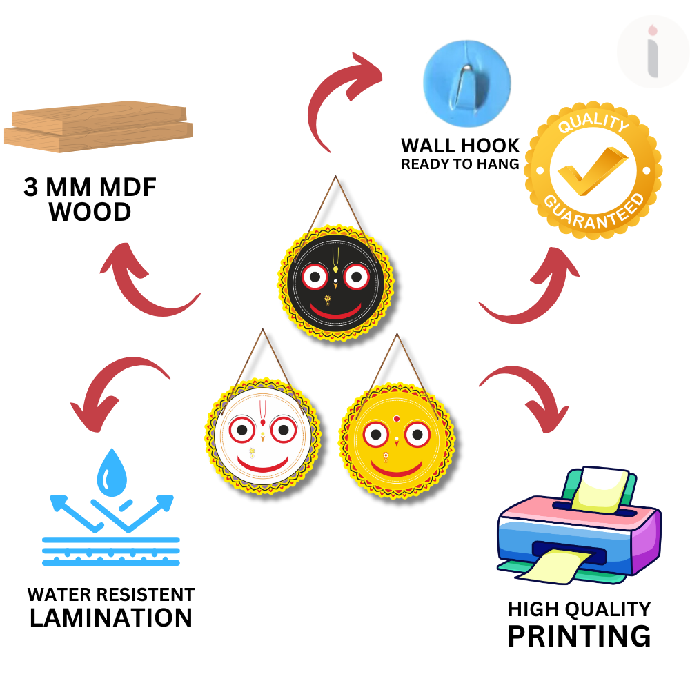 Bring divine blessings home with this vibrant Wall Hanging Set featuring the sacred faces of Lord Jagannath, Balabhadra, and Devi Subhadra. Designed in a bold circular mandala style with bright traditional colors, it adds a spiritual and joyful aura to any room. Perfect for mandirs, entrances, pooja rooms, festivals, or gifting for auspicious occasions.