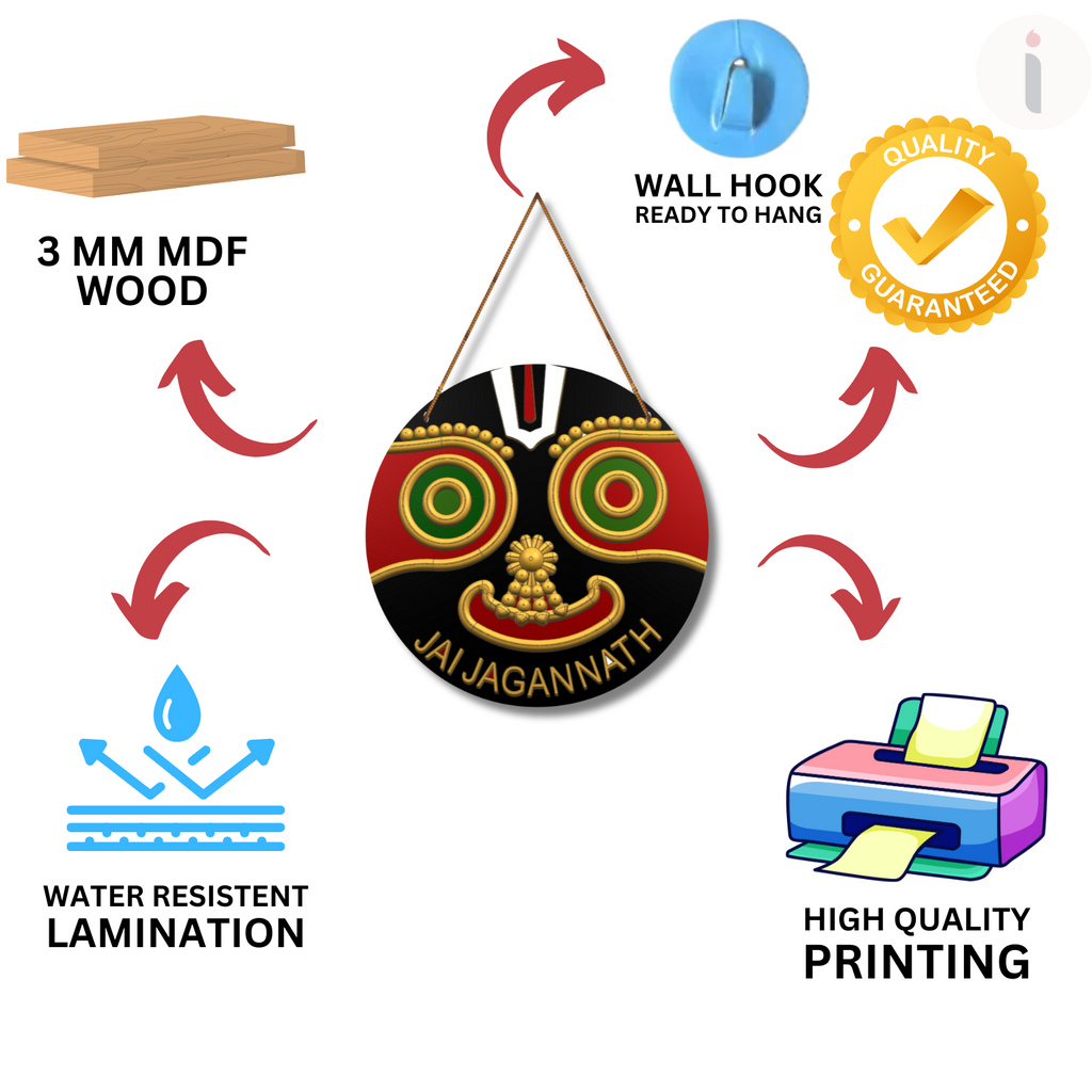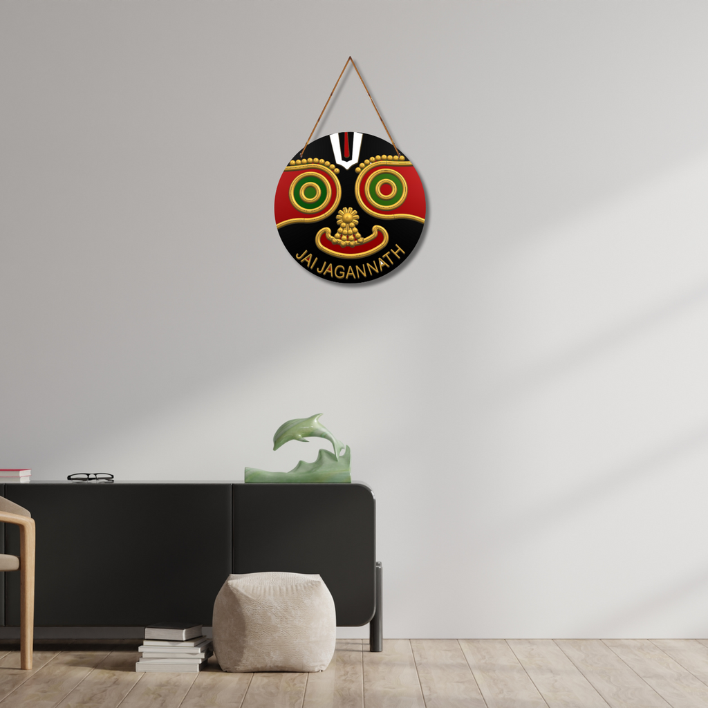 Perfectly circular and adorned with vibrant red, green, gold, and black, it comes ready to hang with a sturdy rope. The text “JAI JAGANNATH” at the bottom enhances its devotional appeal, making it ideal for home temples, pooja rooms, or spiritual corners.