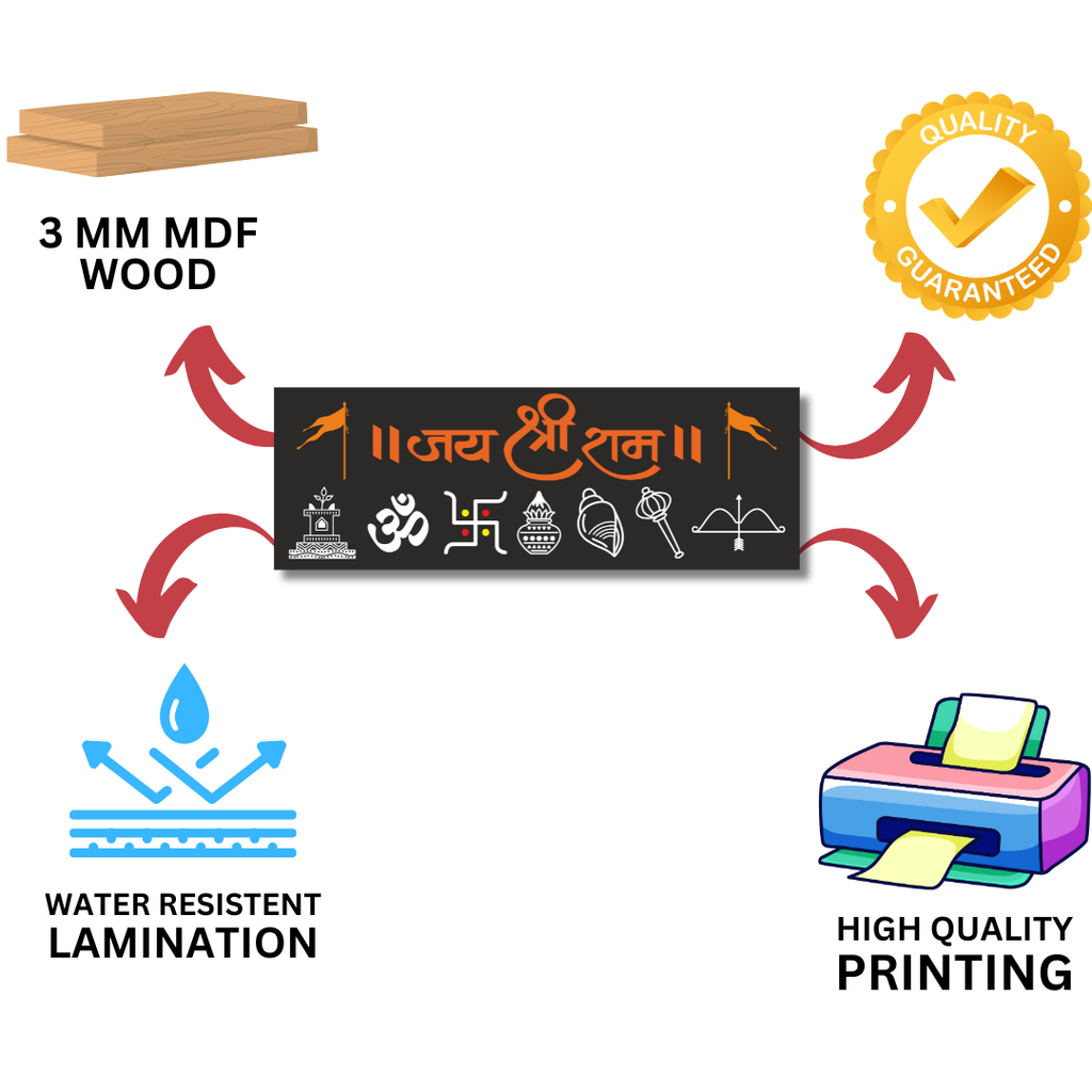 Made from high-quality durable wood, this wall name plate offers a smooth finish, long life, and an elegant aesthetic that blends seamlessly with both modern and traditional interiors. The deep black background allows the multi-colored religious symbols and saffron script to stand out with striking clarity, creating a decor piece that is visually appealing and spiritually uplifting.