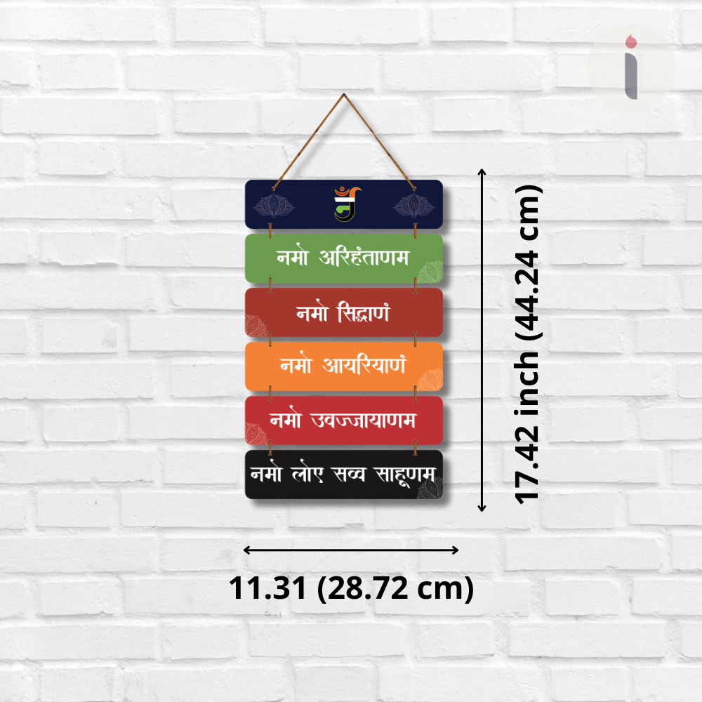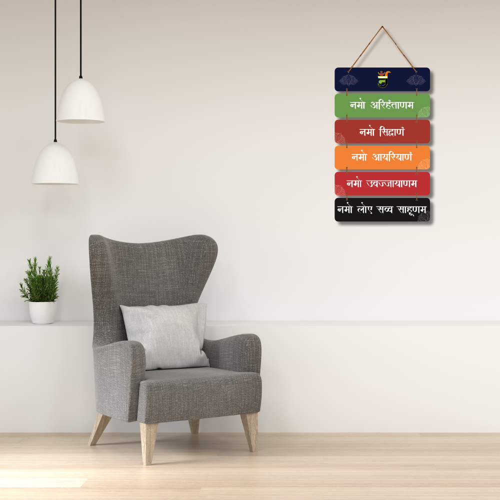 Bring divine positivity into your space with this beautifully crafted Jain Namokar Mantra wooden wall hanging. Featuring each sacred line of the mantra on colorful wooden planks, it spreads peace, purity, and spiritual energy. Ideal for home entrances, meditation rooms, offices, or gifting to Jain families. A meaningful décor piece that reminds you to bow to all who embody wisdom, compassion, and truth.