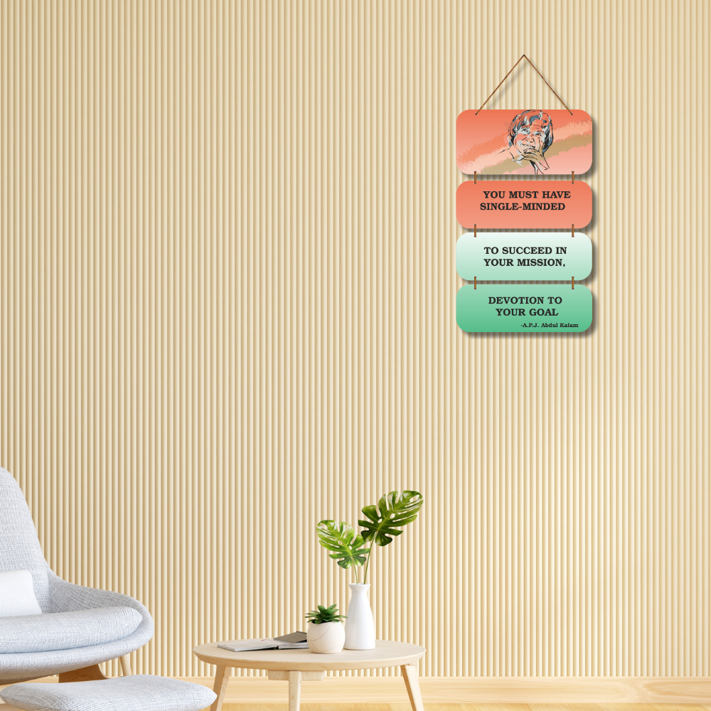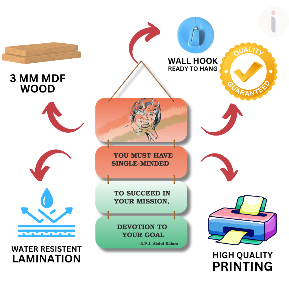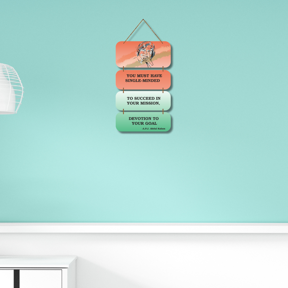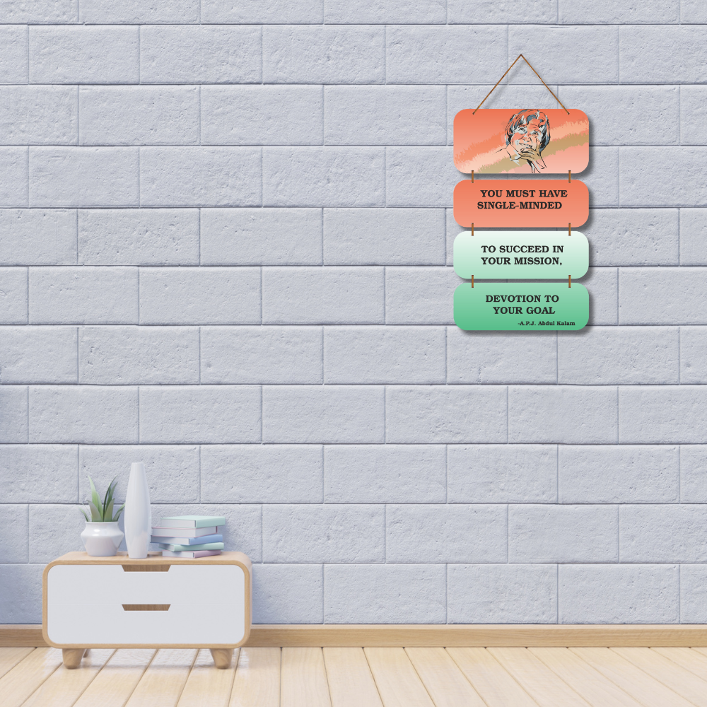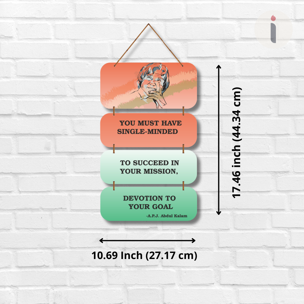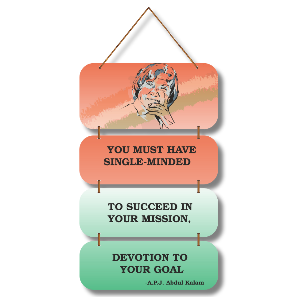 This motivational wall hanging features the inspiring words of Dr. A.P.J. Abdul Kalam, encouraging single-minded devotion to one’s goals. With a vibrant design and a thoughtful illustration of the “Missile Man of India,” it serves as a daily reminder to stay focused and determined. Perfect for study rooms, offices, and classrooms to spark ambition and perseverance.