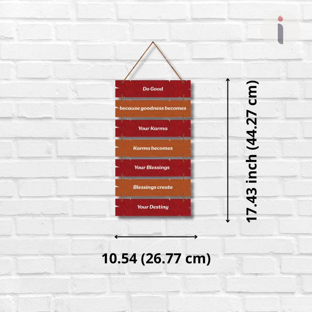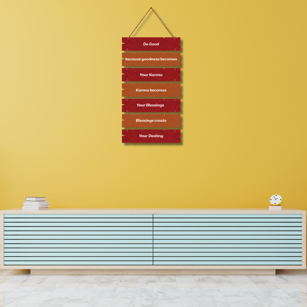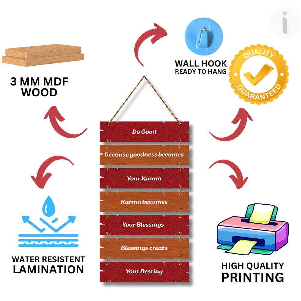 Elevate your wall décor with this inspiring wooden hanging that reminds you of the power of good deeds and positive energy. Featuring alternating panel colors and motivational text, it beautifully explains how goodness becomes karma, karma turns into blessings, and blessings shape your destiny. A perfect addition to living rooms, offices, meditation spaces, or as a thoughtful gift.