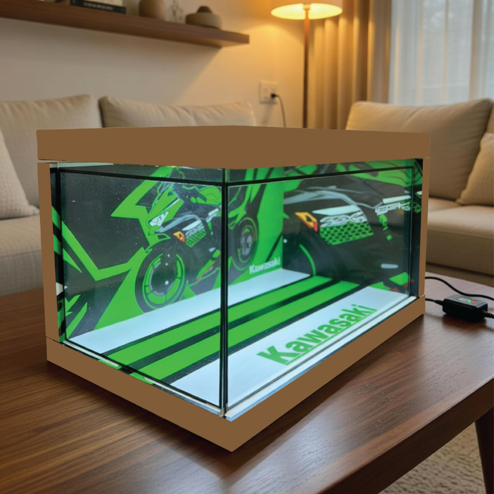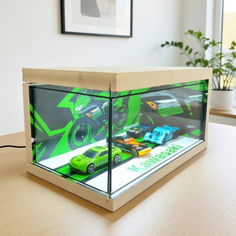 Crafted with a strong wooden frame 🪵 and a high-quality printed backdrop showcasing Kawasaki sportbike graphics and performance styling, it creates a dynamic and eye-catching showroom environment. The bright LED lighting 💡 enhances every detail, giving your cars a sharp and energetic “showroom-ready” presence. ✨