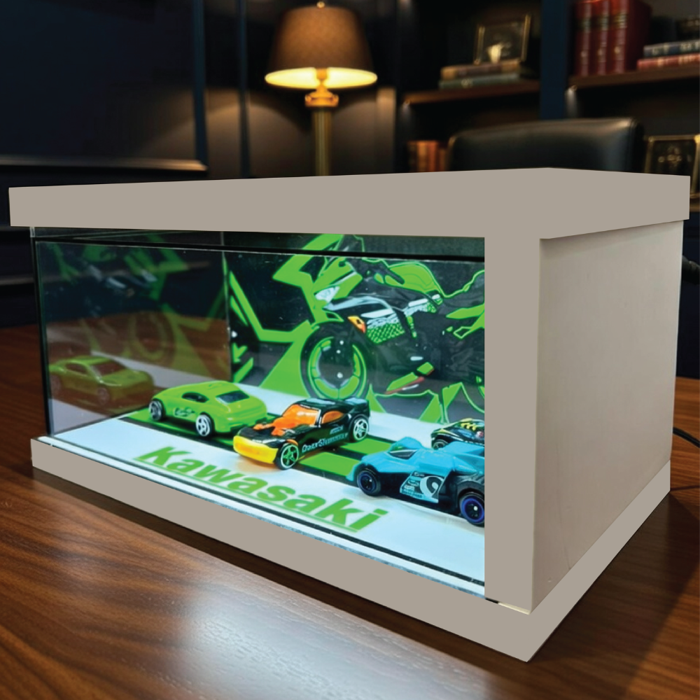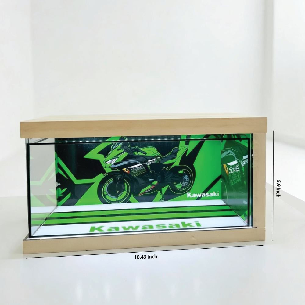 Upgrade your diecast car collection with the Kawasaki Showroom Car Diorama, designed to deliver a bold and sporty display inspired by the aggressive performance and racing DNA of Kawasaki. Featuring a vibrant green and black themed backdrop with superbike-inspired visuals, this diorama captures the essence of speed, power, and adrenaline.