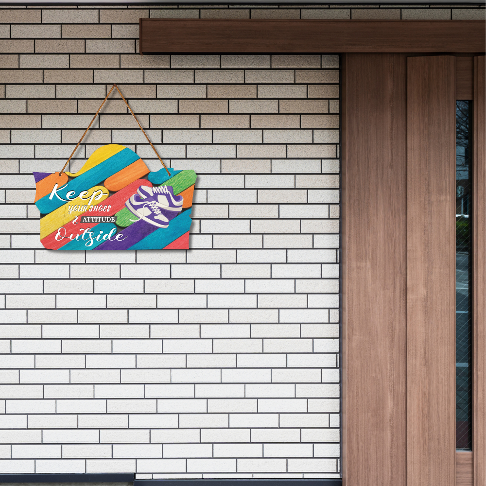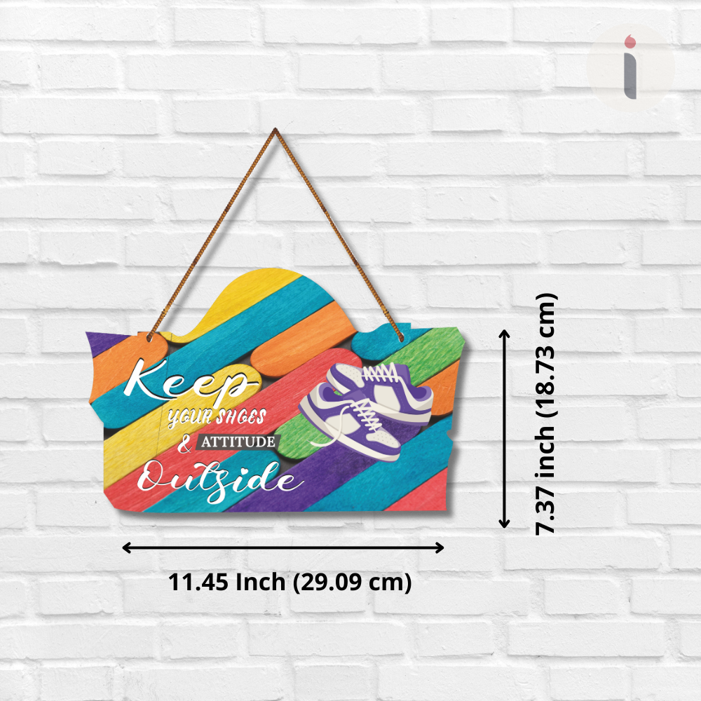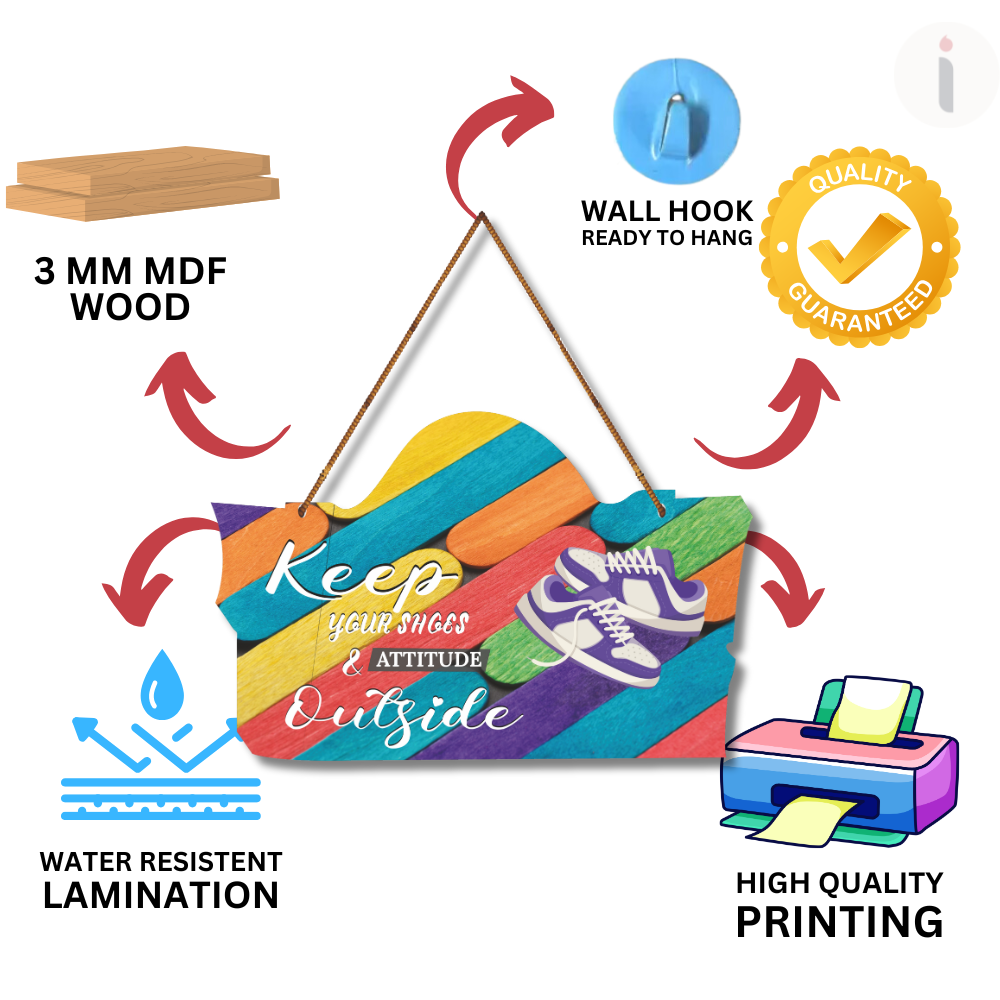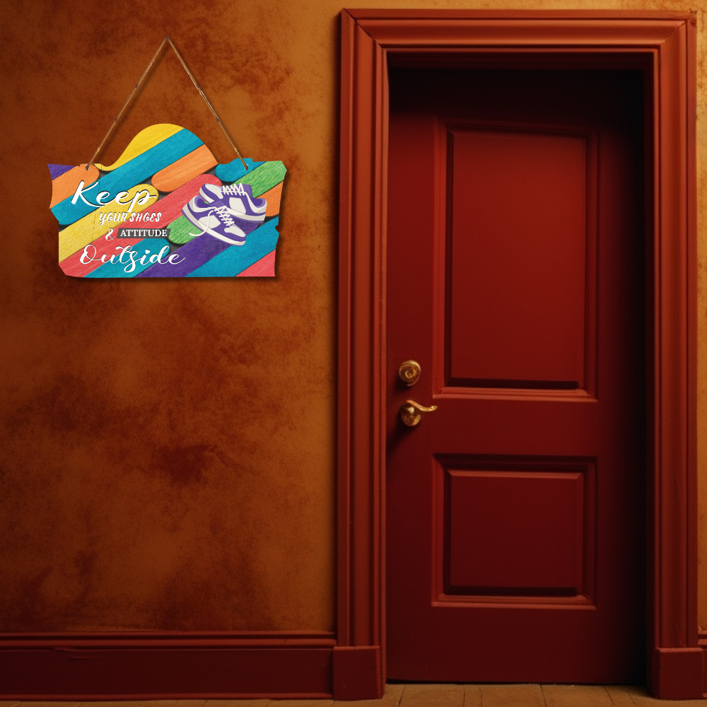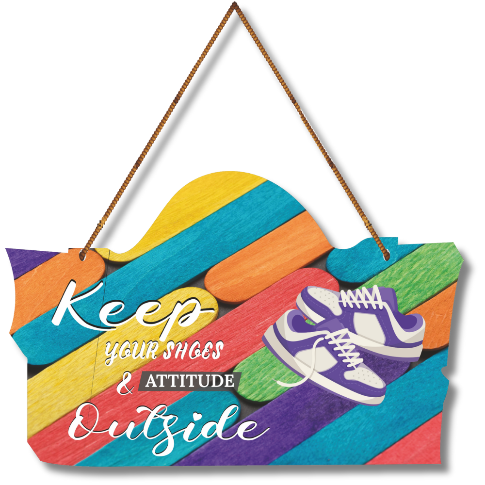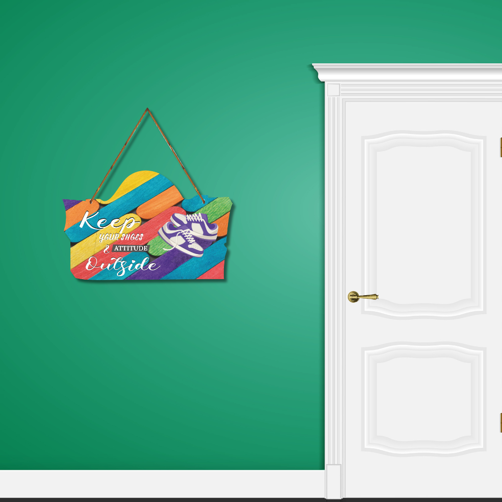 This quirky and colorful wall hanging carries a fun yet meaningful message: “Keep your shoes & attitude outside.” Designed with vibrant rainbow shades and a playful shoe illustration, it adds a cheerful touch to your entrance. Perfect for homes, offices, or cafes, it warmly welcomes guests while reminding everyone to step in with positivity and good vibes.